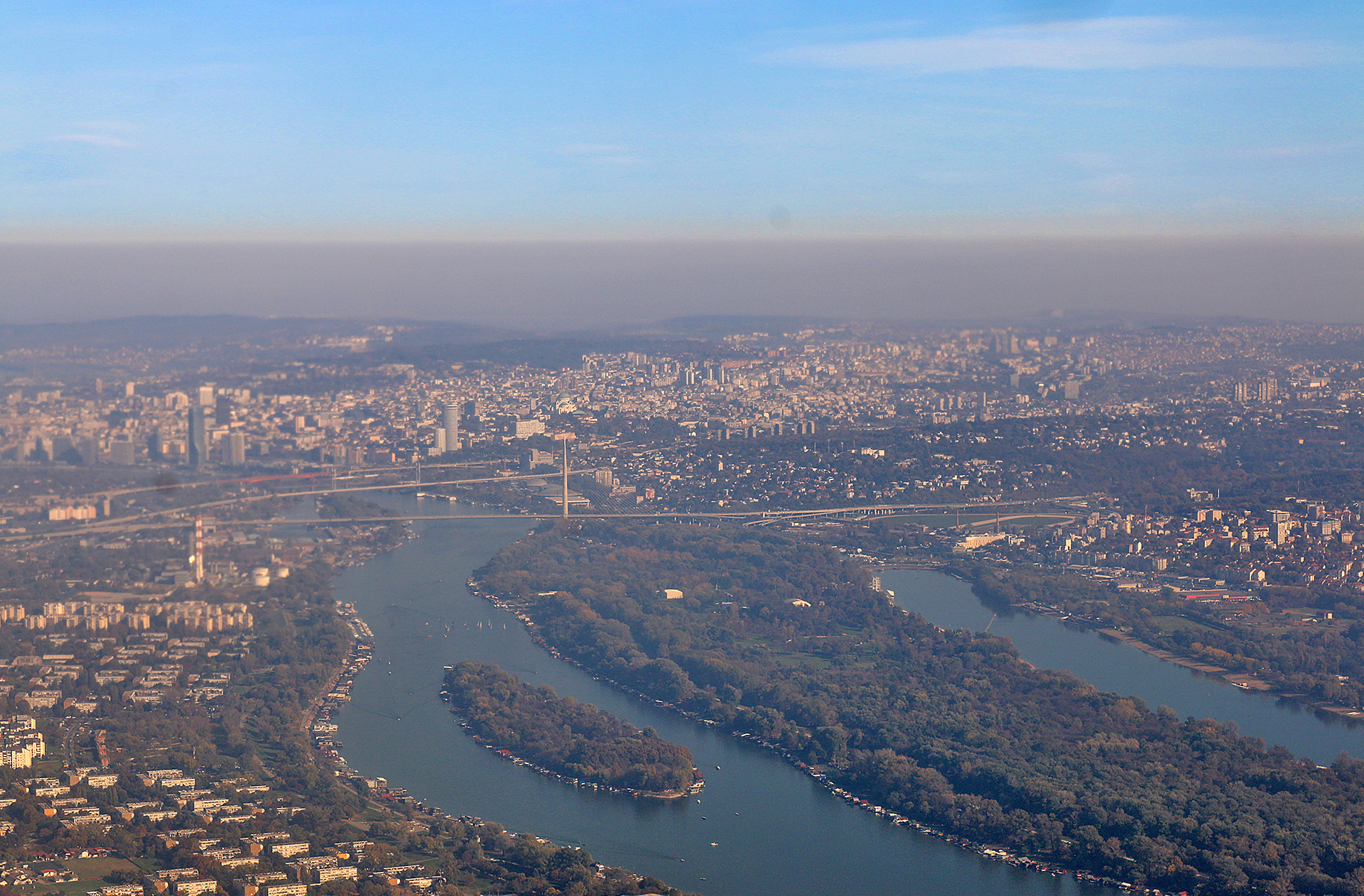 The sky was somewhat clear and the humidity was fairly low as the airplane ascended, which revealed an aerial view of Belgrade in Serbia moments after departure from Belgrade Nikolai Tesla Airport when I flew as a passenger aboard an Avions de Transport Régional ATR 72-500 airplane to Tirana that was operated by Air Serbia.