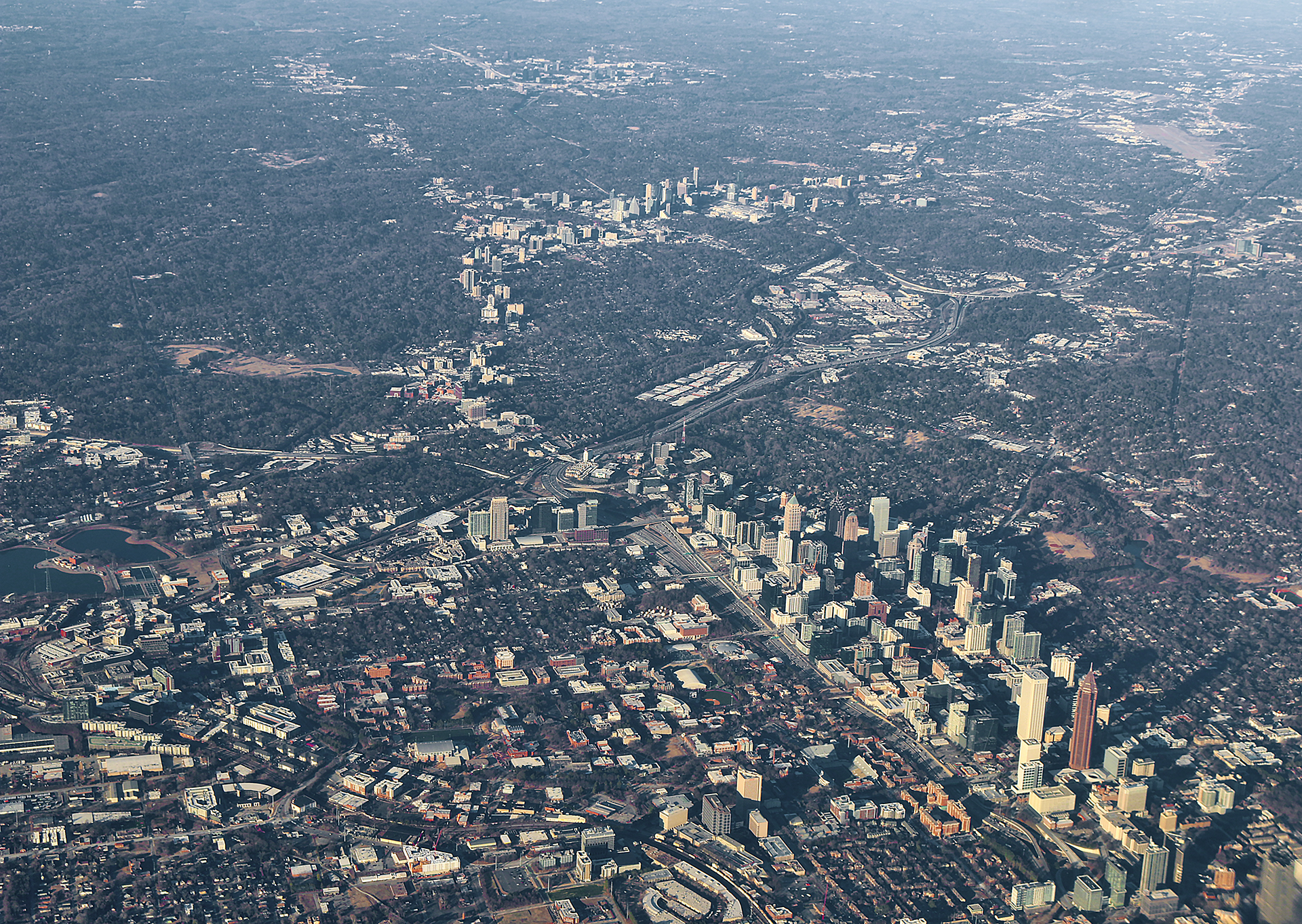 The sky was clear and the humidity was low as the airplane descended, which revealed a clear aerial view of Midtown Atlanta moments prior to landing at the airport.