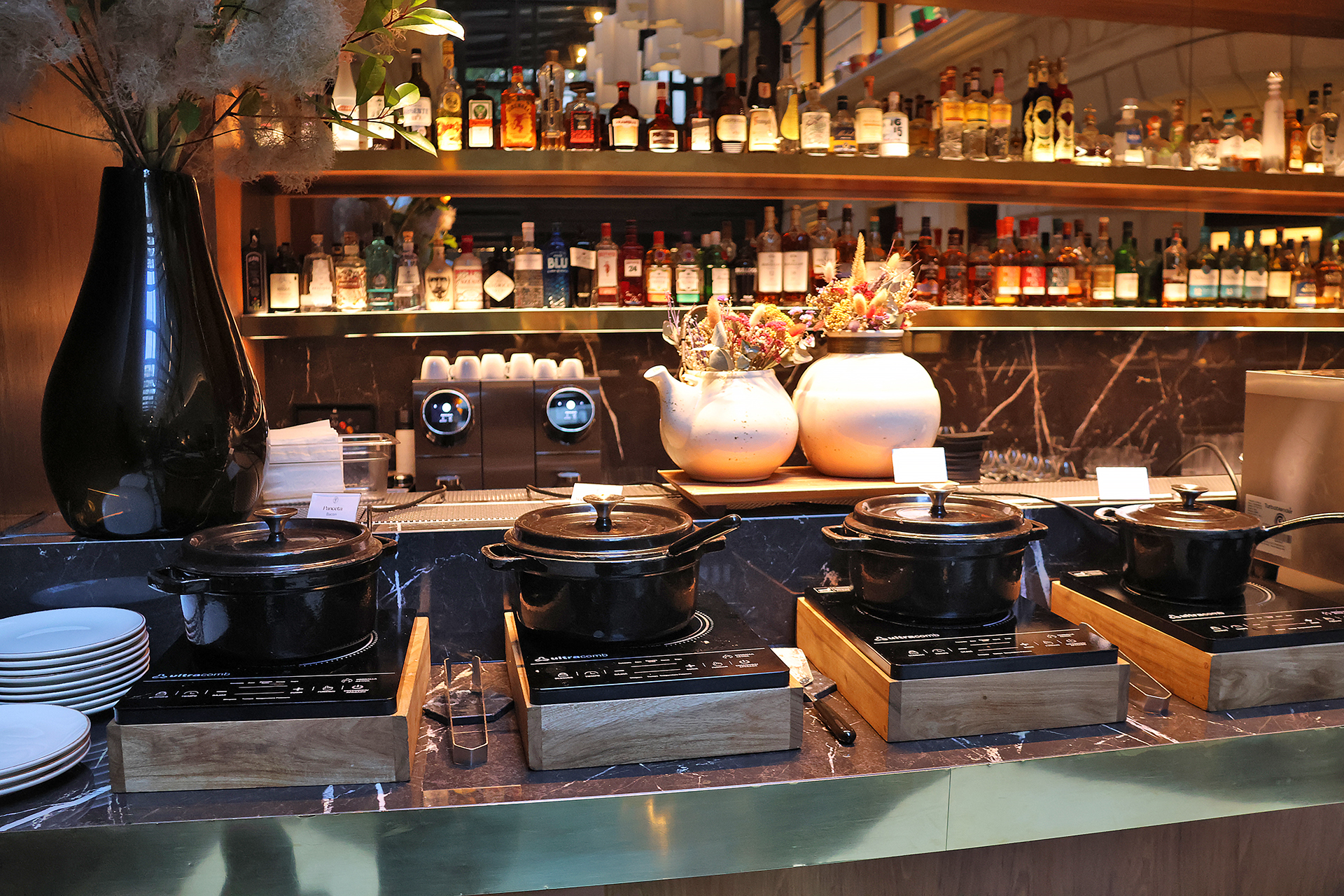 The hot items — such as bacon — as well as assorted breads, pastries, and sweet condiments — were arranged at one station…