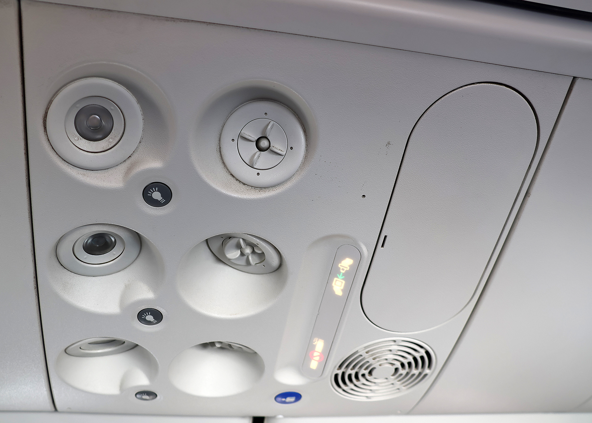 The Passenger Service Unit above the row of seats was equipped with lights, somewhat reasonably powered air vents that can be adjusted, and one small blue flight attendant call button for three seats instead of one for each seat.