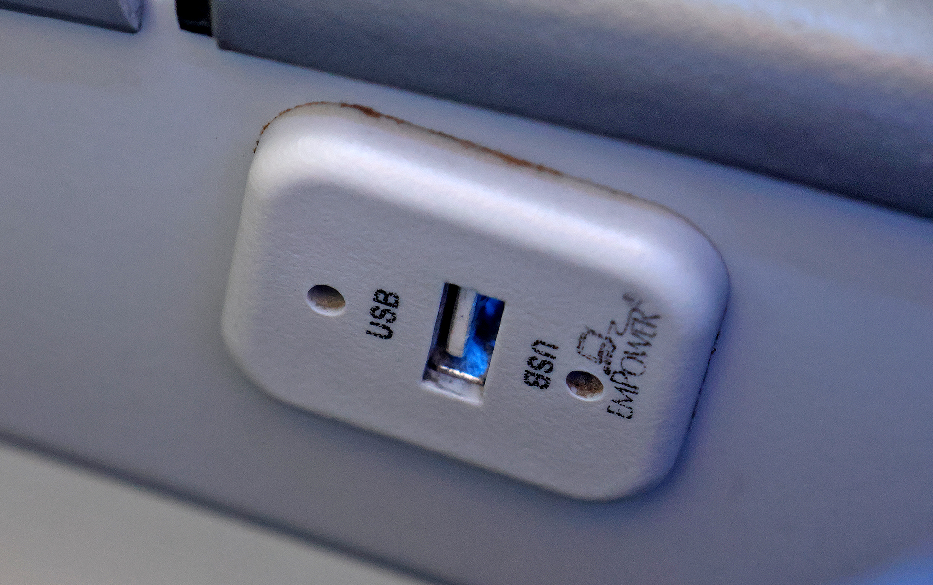 A Universal Serial Bus Type A port was located on the side of each armrest — which came in quite handy for me to use my portable electronic device, as no in-flight entertainment was offered.