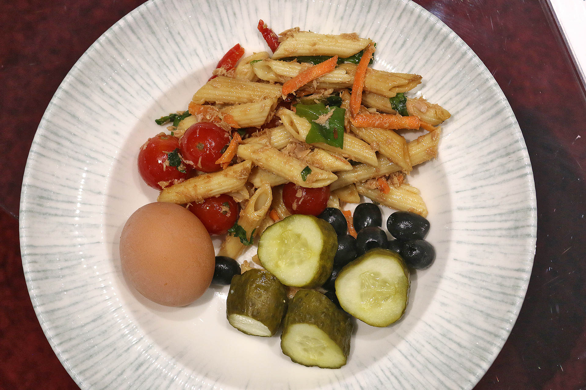 Assorted fresh fruit, sliced cake, sliced bread, rolls, and condiments were among the items that were available — as well as penne pasta, olives, pickles, and other salad items.