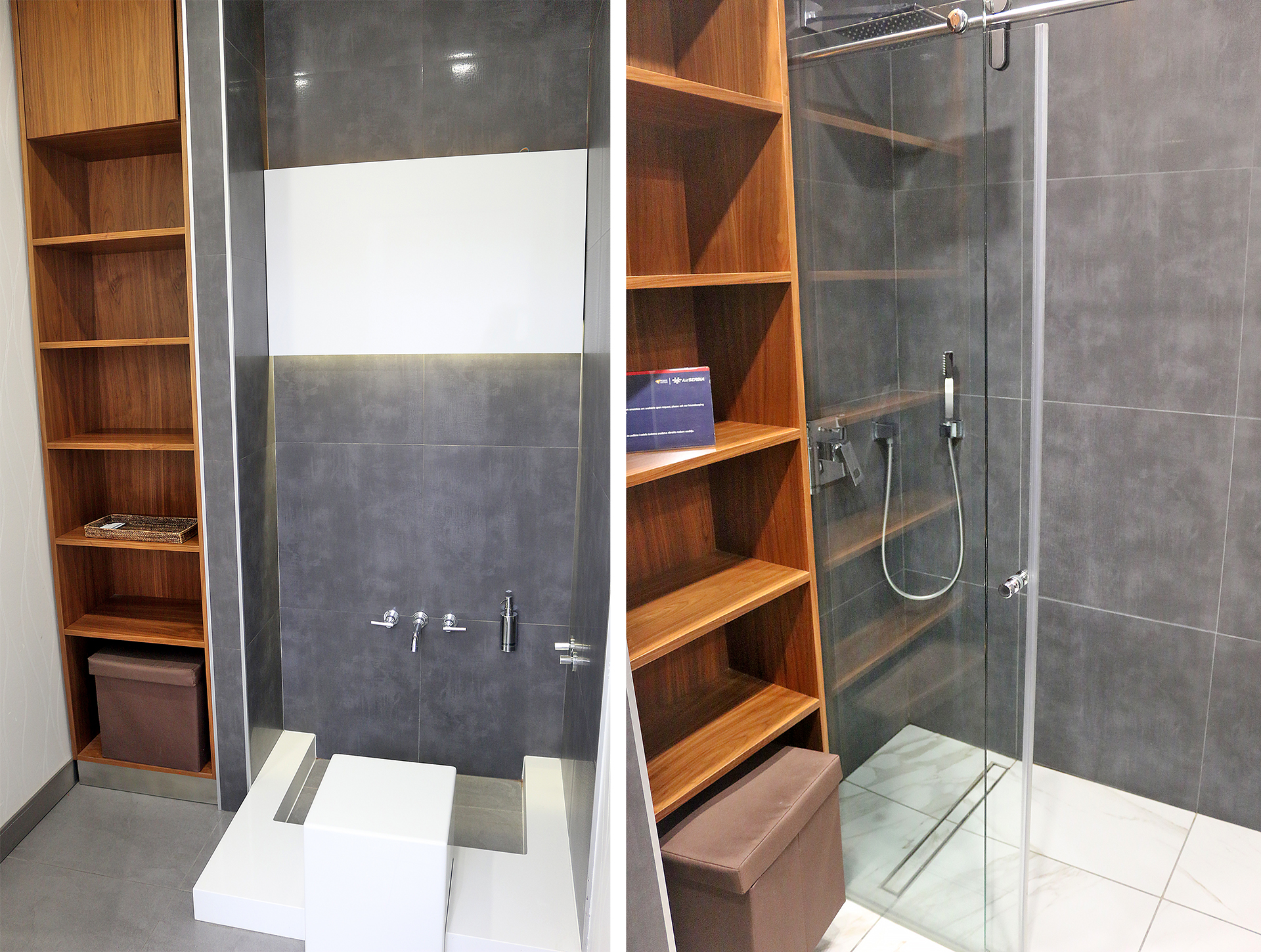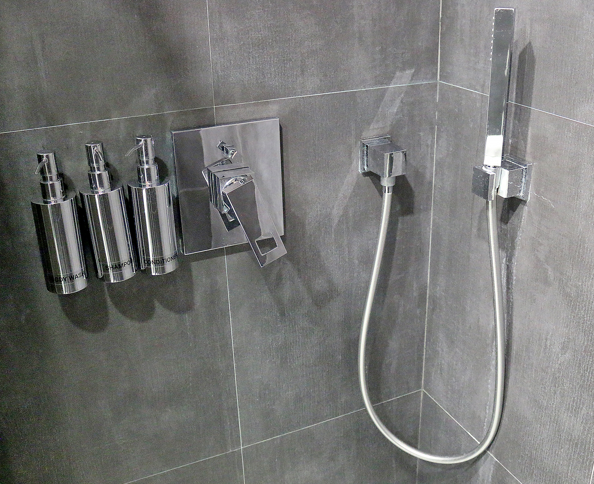 Showers were available in the washrooms with bulk dispensers of body wash, shampoo, and conditioner.