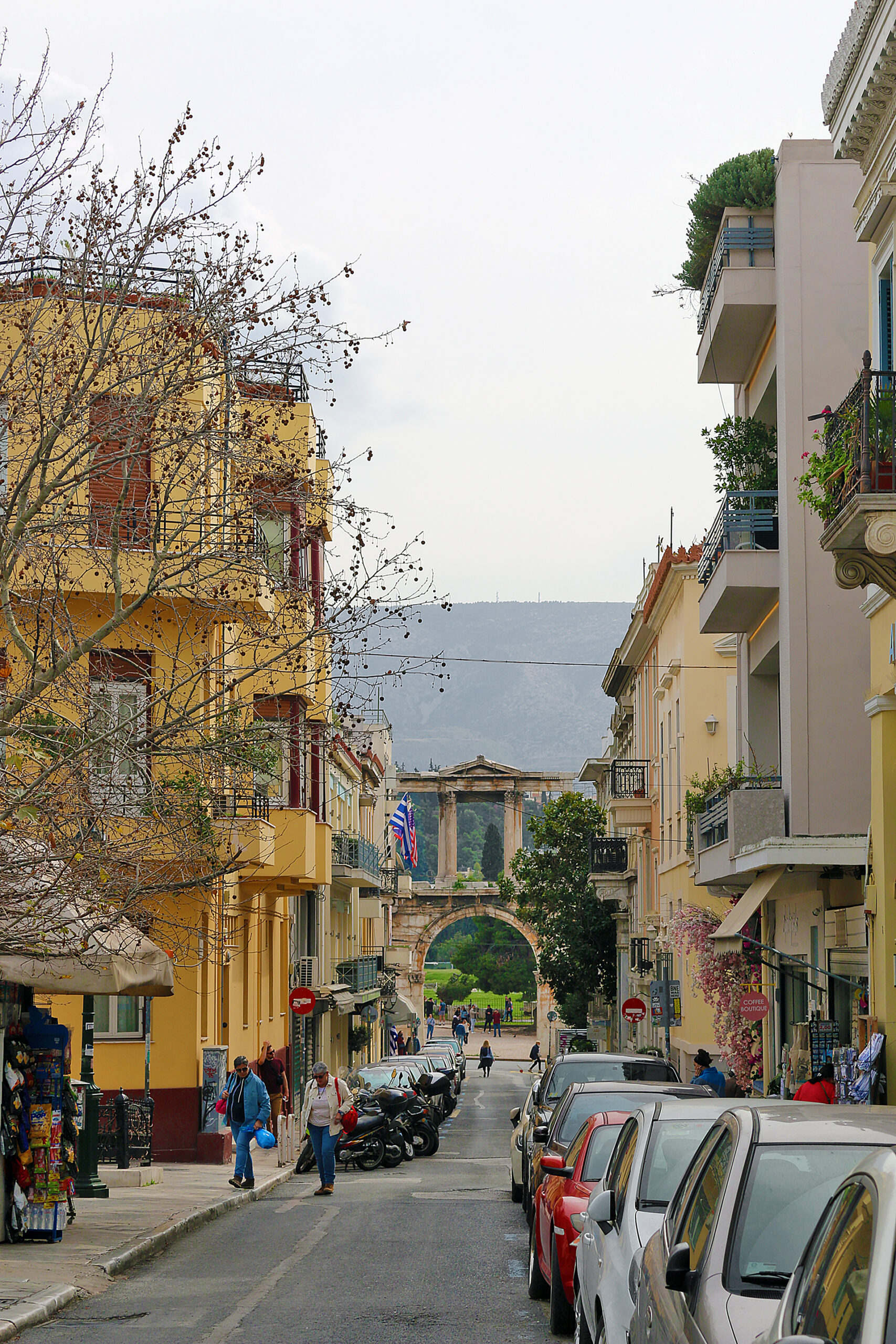 A view of the Arch of Hadrian emerges as one walks east southeast on a street called Lisikratous.
