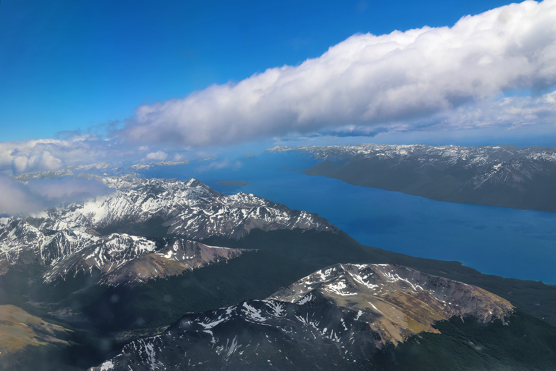 Much of the view along the way comprised of cumulous clouds and the Atlantic Ocean beneath them — which was rather monotonous — but one obvious sign that we were approaching Ushuaia was the view below of the Martial Mountains, which is at the southernmost part of the Andes mountain range in Tierra del Fuego and were capped with snow on this late spring day.