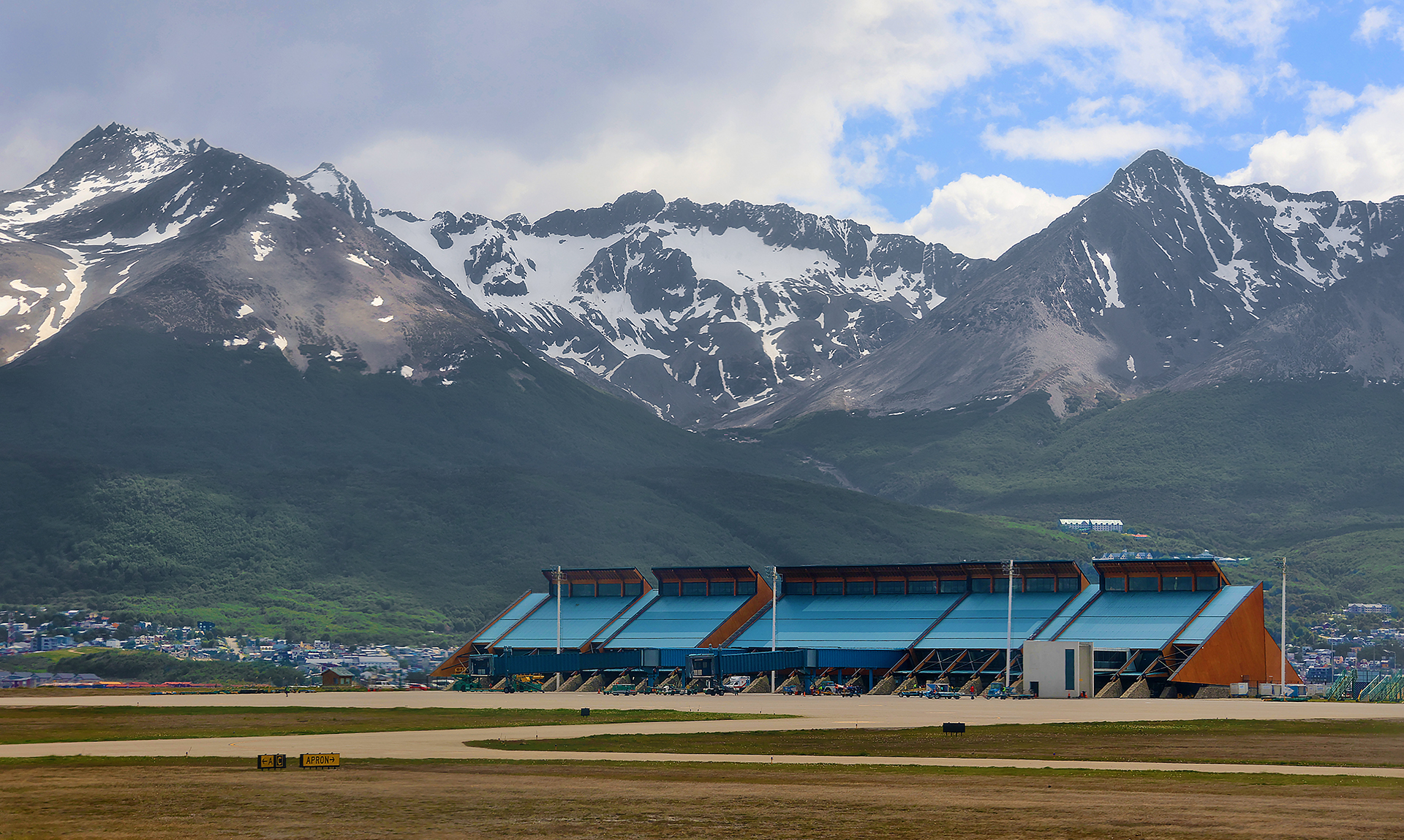 The city of Ushuaia itself is seen behind the terminal of Ushuaia – Malvinas Argentinas International Airport after the airplane landed and was decelerating on the runway.