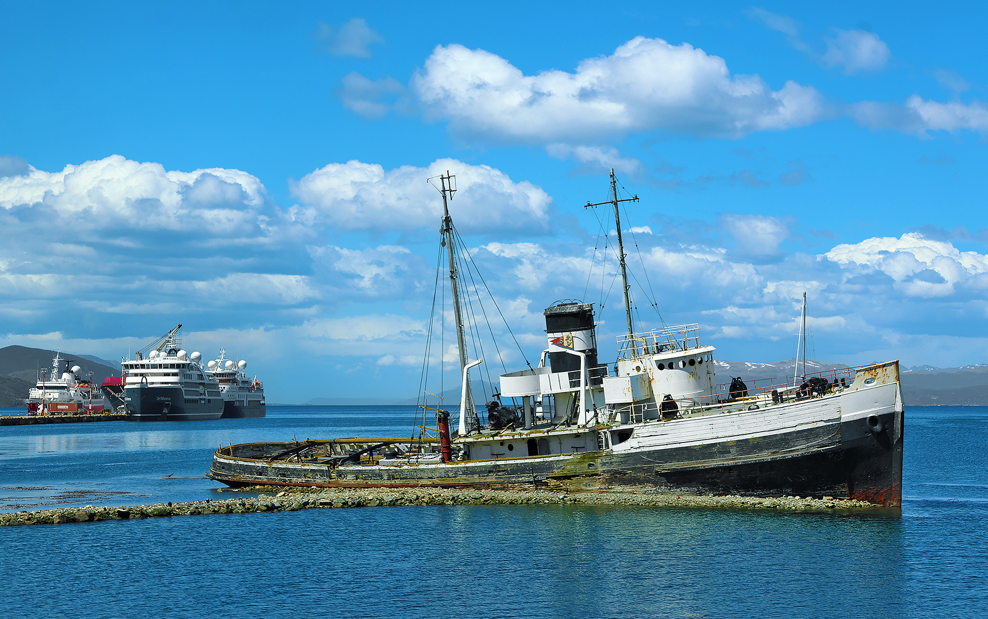 This ship was built in 1943 by Camden Shipbuilding Company in New Jersey and was commissioned as the HMS Justice in 1944. In 1946 — after World War II had ended — the ship was returned to the United States Navy and decommissioned in 1947. Later that year, it was sold and was renamed the Saint Christopher, which was chartered in 1953 for salvage operations for several vessels in the Beagle Channel. After suffering from engine trouble and rudder damage in 1954, the Saint Christopher was beached and abandoned in Ushuaia in 1957, where it is still grounded and abandoned to this day.