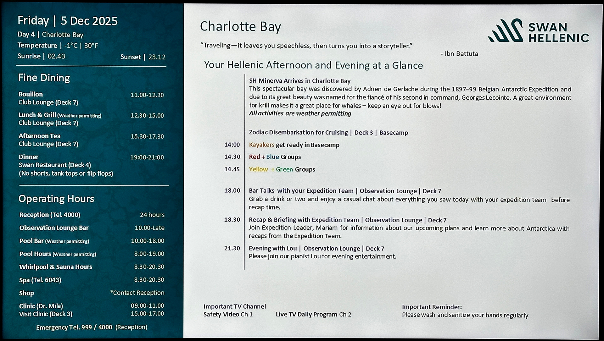 We spent the afternoon on Charlotte Bay, which was plenty of time to observe and enjoy the landscape and the waters surrounding us — as well as the numerous whales and penguins, of course! We then went to the Swan Restaurant to enjoy dinner before repairing to our staterooms and retiring for the evening.