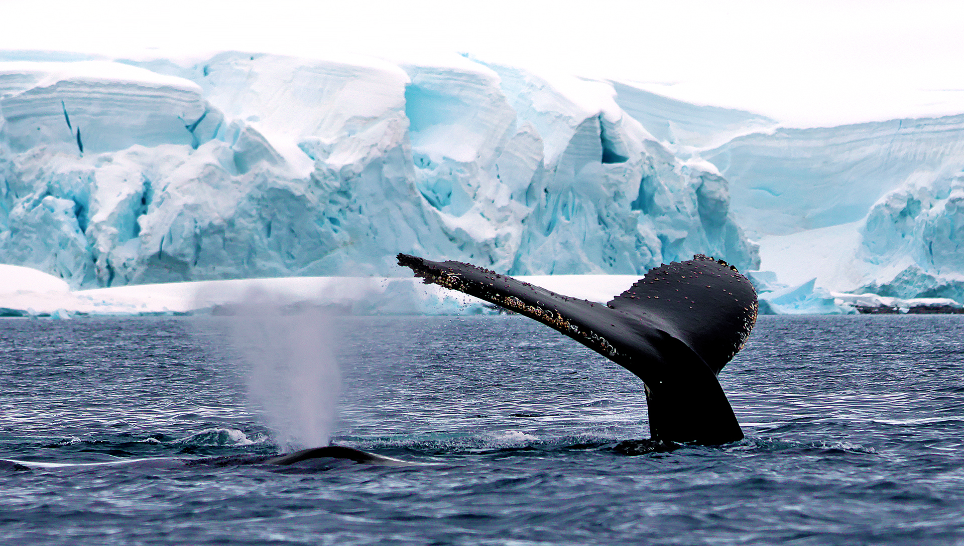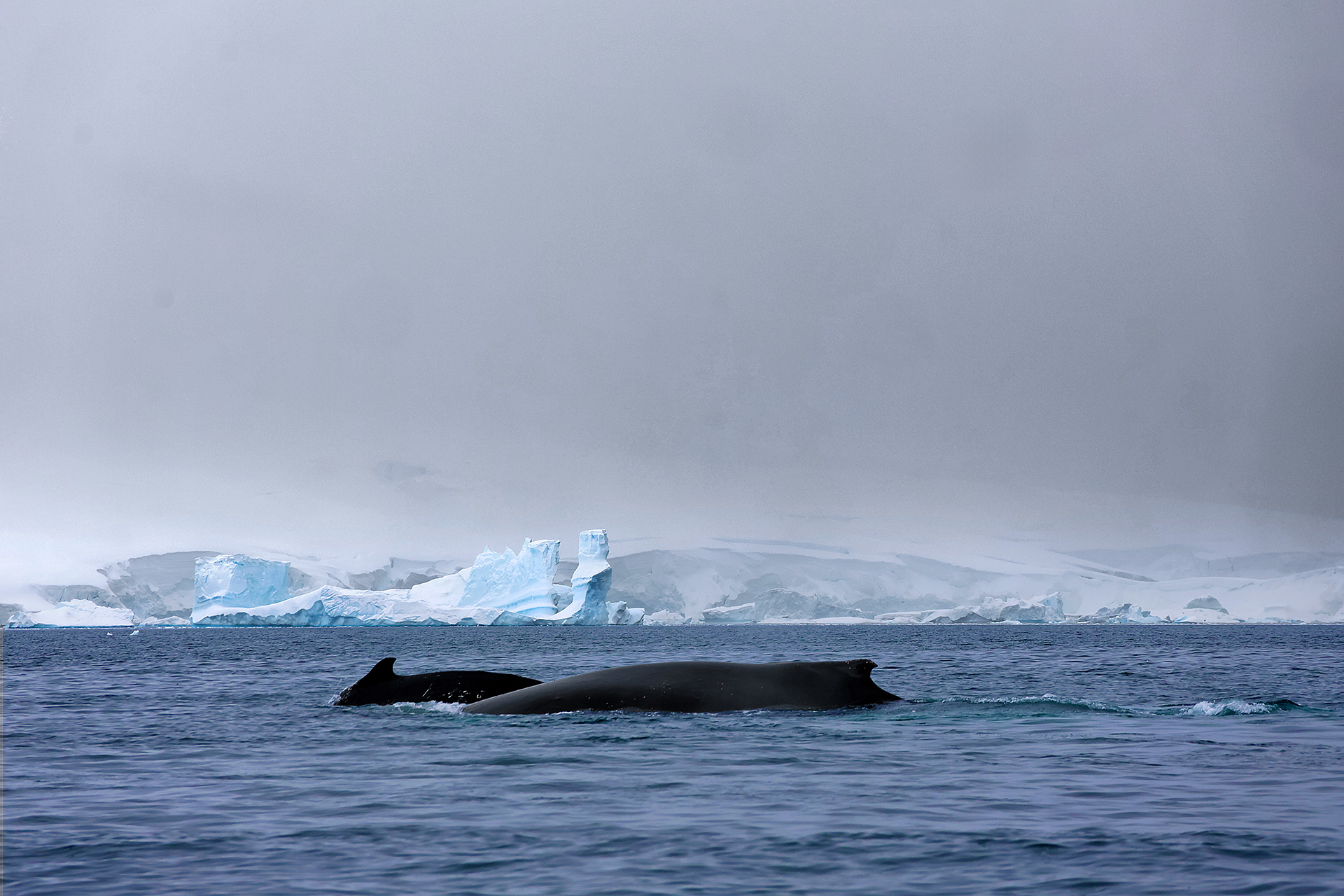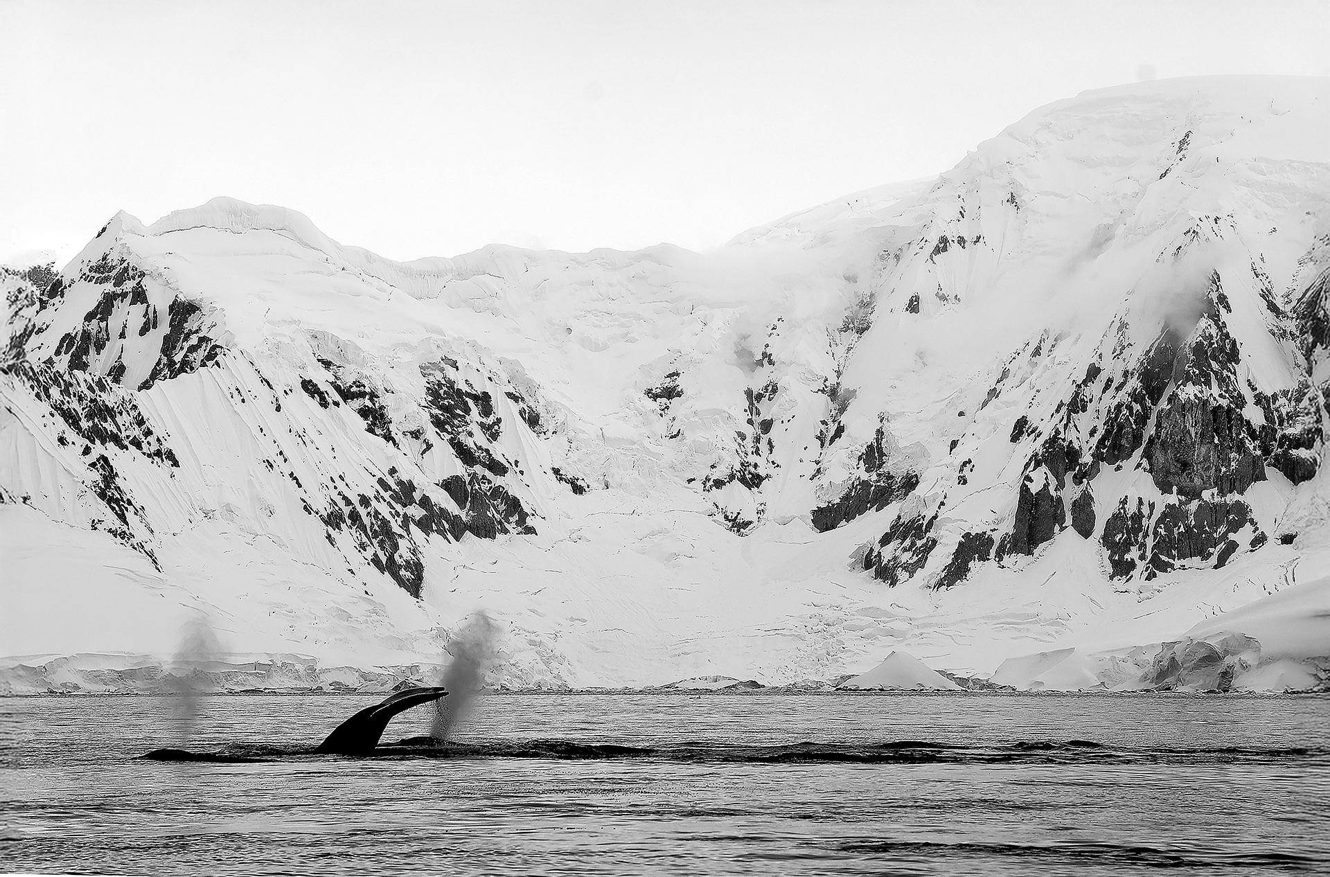 At least three different humpback whales were in this pod, judging by the two visible spouts and one tail. This photograph proves that Antarctica is breathtakingly beautiful — even in simple black and white.