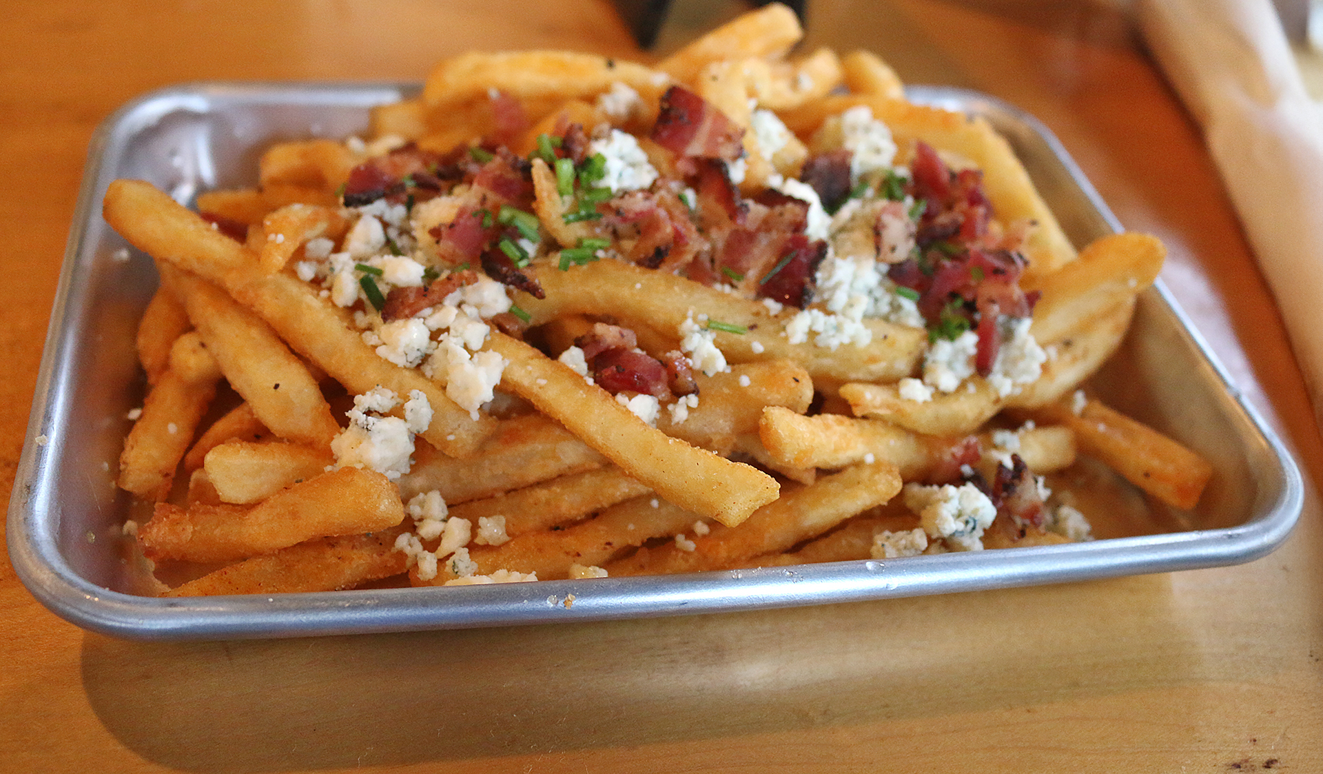 We started with the Truffle Shuffle Straws, which were house fries topped with white truffle oil, bleu cheese, bacon, and chives — and was eventually polished off with but a few crumbs to prove that something once occupied the metal tray. $12.50