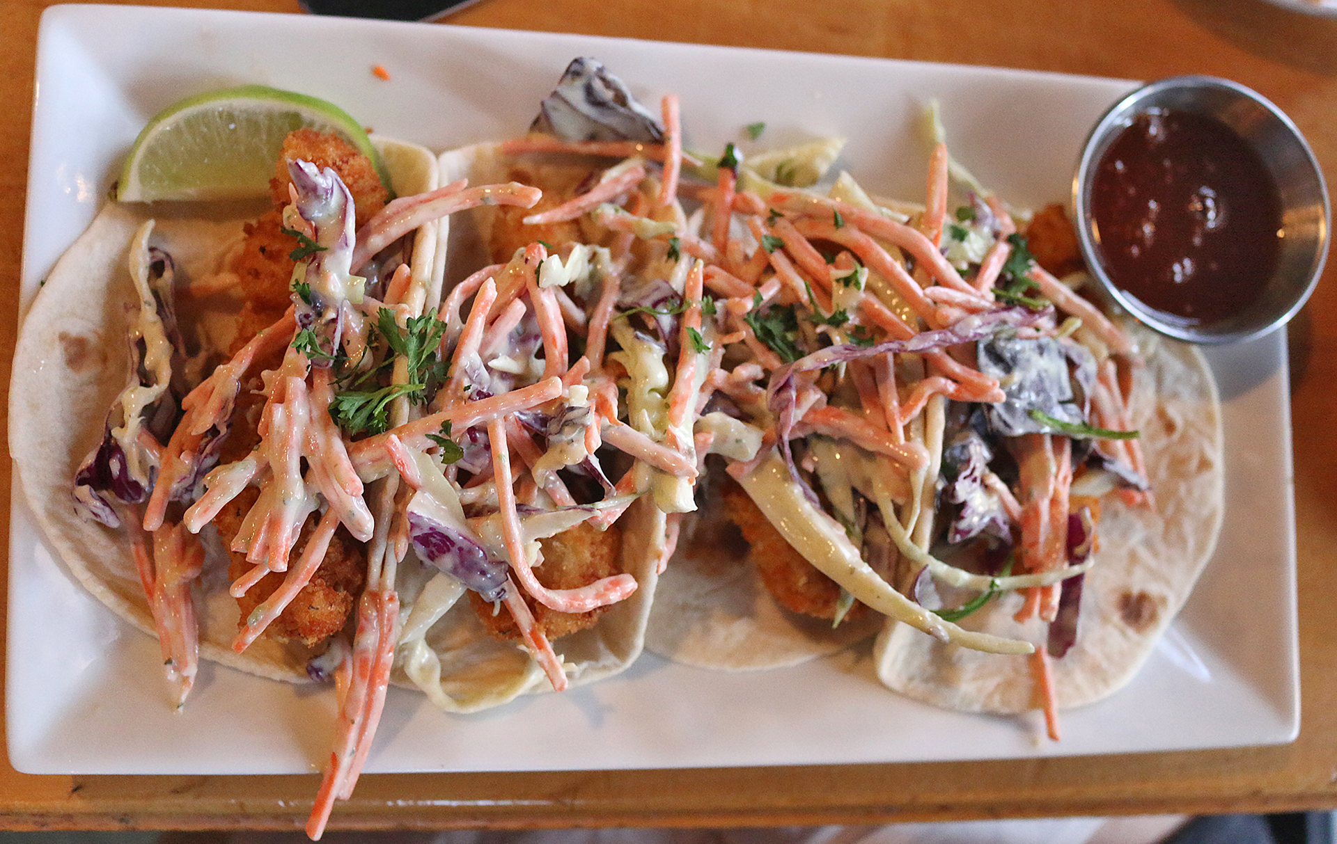 Fish Tacos were comprised of panko-breaded white fish with fresh cabbage and pickled carrots tossed in avocado ranch on flour tortillas. It is served with hot honey. The textures of the crisp cabbage and the slightly crunchy fried fish complemented the softness of the tacos. $17.00