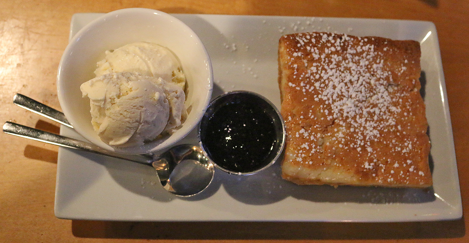 I did not order the Ooey Gooey Buttercake Ice Cream Sandwich — which was two slices of house ooey gooey buttercake folded over two scoops of vanilla bean ice cream — but I did try it. This dessert was true to its name, as it was way too buttery for my taste — but I did like the ice cream. The plate was eventually empty — but not by me.
