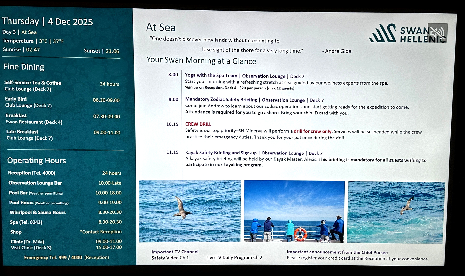 The first thing we did upon awakening the next day was to view the monitor to see what was on the schedule for the day. We did not attend yoga with the spa team.
