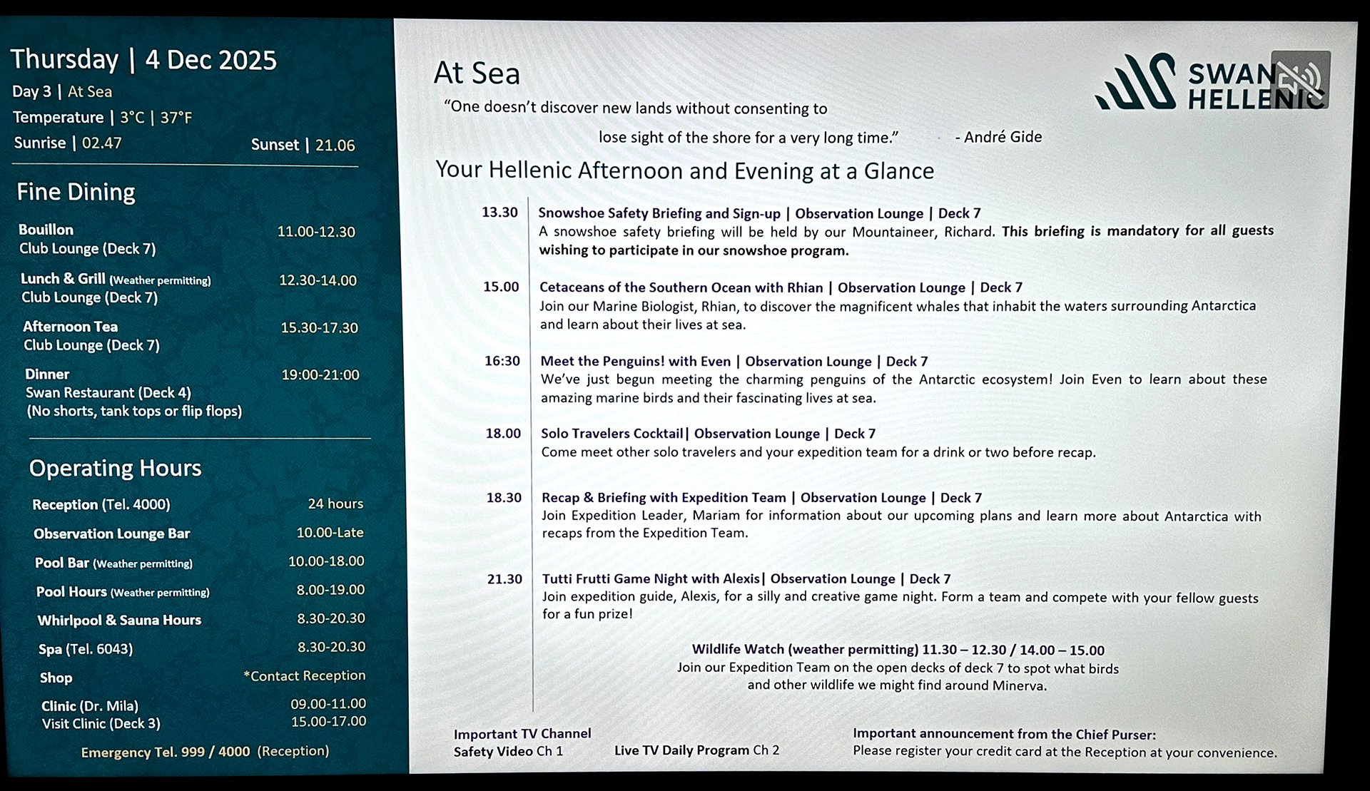 Before formally exchanging parkas, guests were required to attend a briefing in the Observation Lounge for environmental protocols while in Antarctica as mandated by the International Association of Antarctica Tour Operators. Our room keys — which doubled as identification tags and were attached to lanyards — were scanned at the entrance of the Observation Lounge as proof that we attended the briefing, as any guest who failed to attend this meeting would not be permitted to set foot on Antarctica. You can be sure that all guests aboard the vessel attended this briefing!