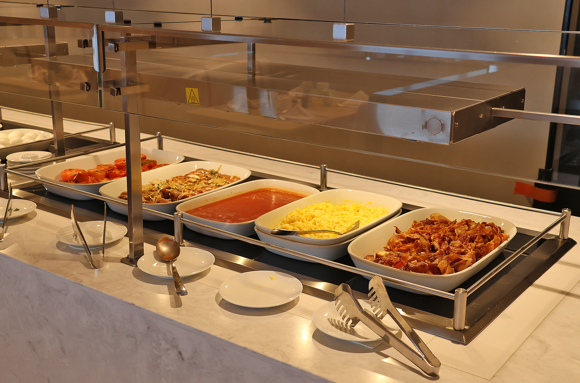 Included with breakfast were hot items — such as strips of bacon, sausages, scrambled eggs, and stewed tomatoes…