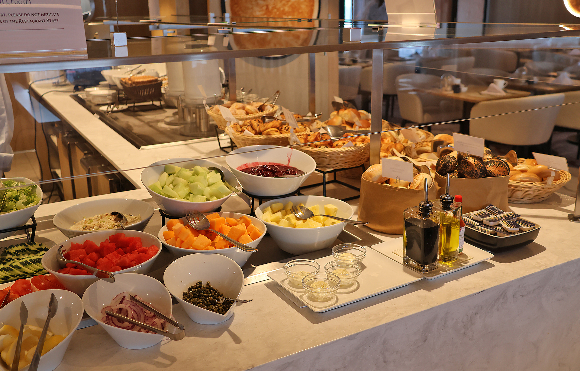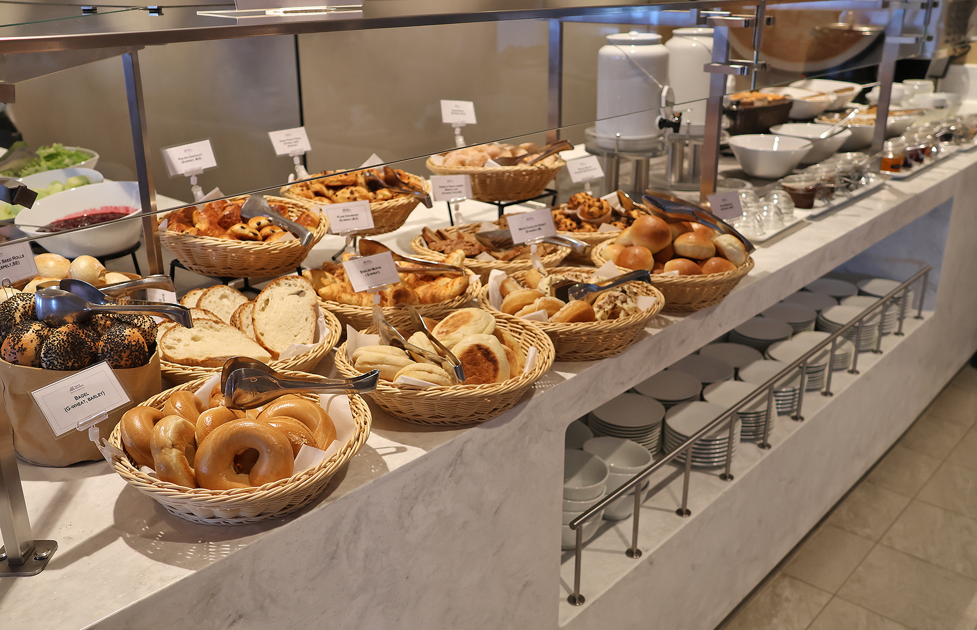 …as well as assorted fresh breads, rolls, croissants, bagels, muffins, and pastries.