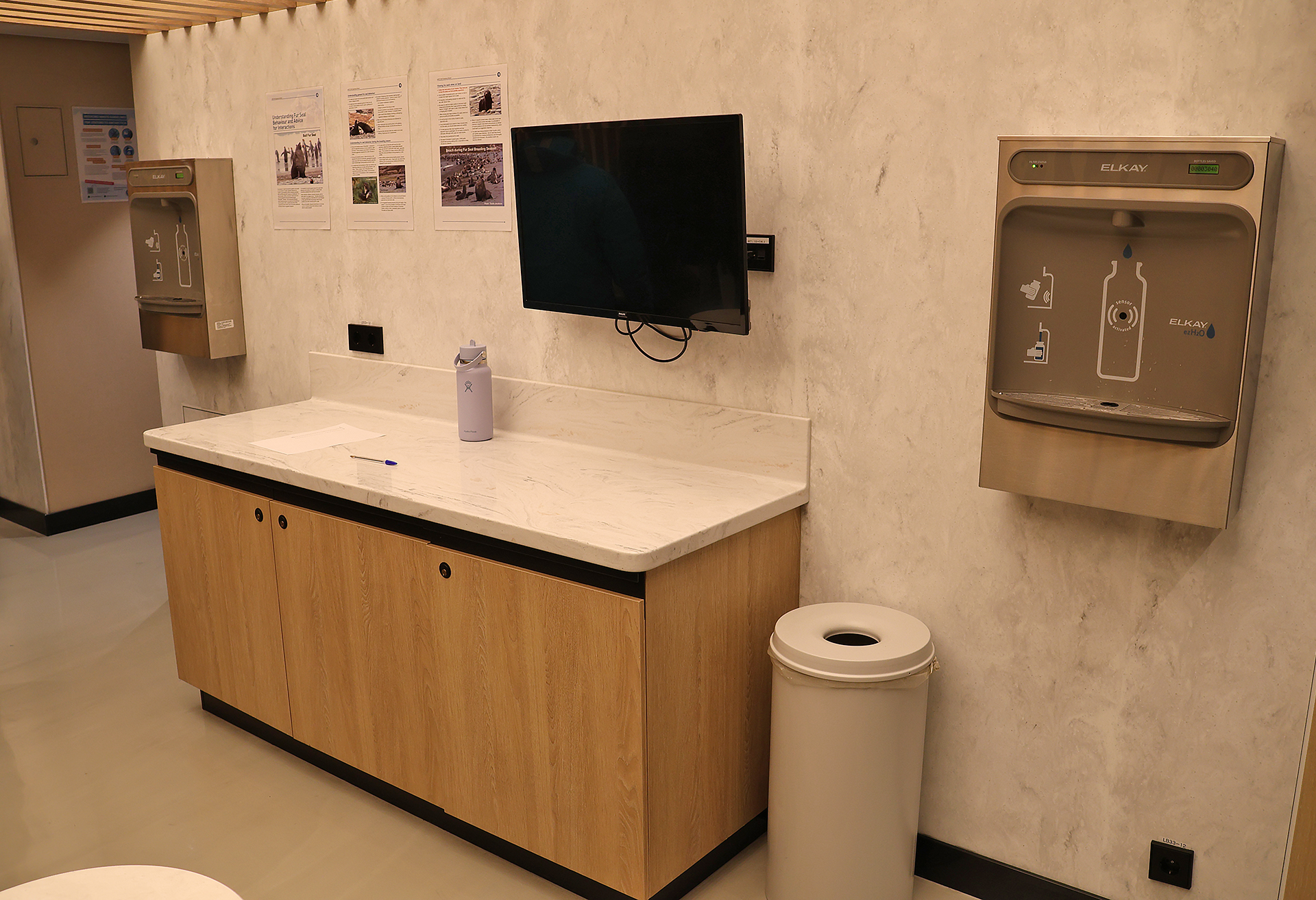 Another area of the BaseCamp had what appeared to be an ordinary counter with a small flat screen monitor attached to the wall and two machines which dispensed filtered water. This counter was actually used after each outing to Antarctica for a member of the staff to serve either hot chocolate or a flavor of tea.