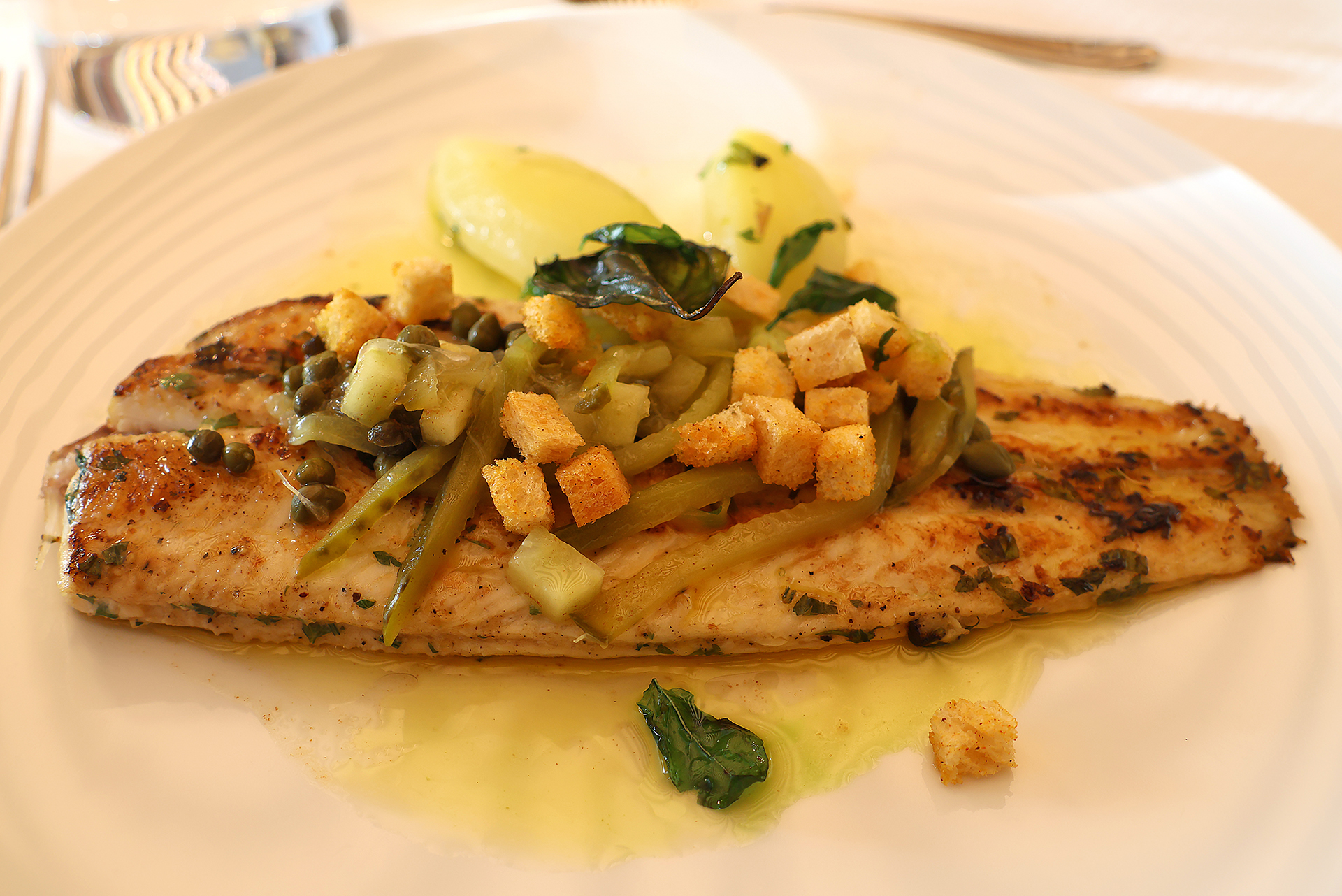 …but the fish needed to be deboned — which actually was not a problem at all. I simply opened the fish in half and neatly pulled the spine out. Other guests at the table who ordered this dish unfortunately did not accomplish the deboning so easily.