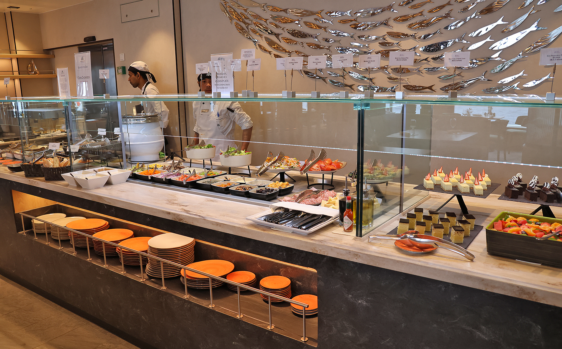 Fresh fruit and vegetables, smoked fish, salads, assorted cheeses, and a wide variety of condiments were also available at the breakfast buffet…