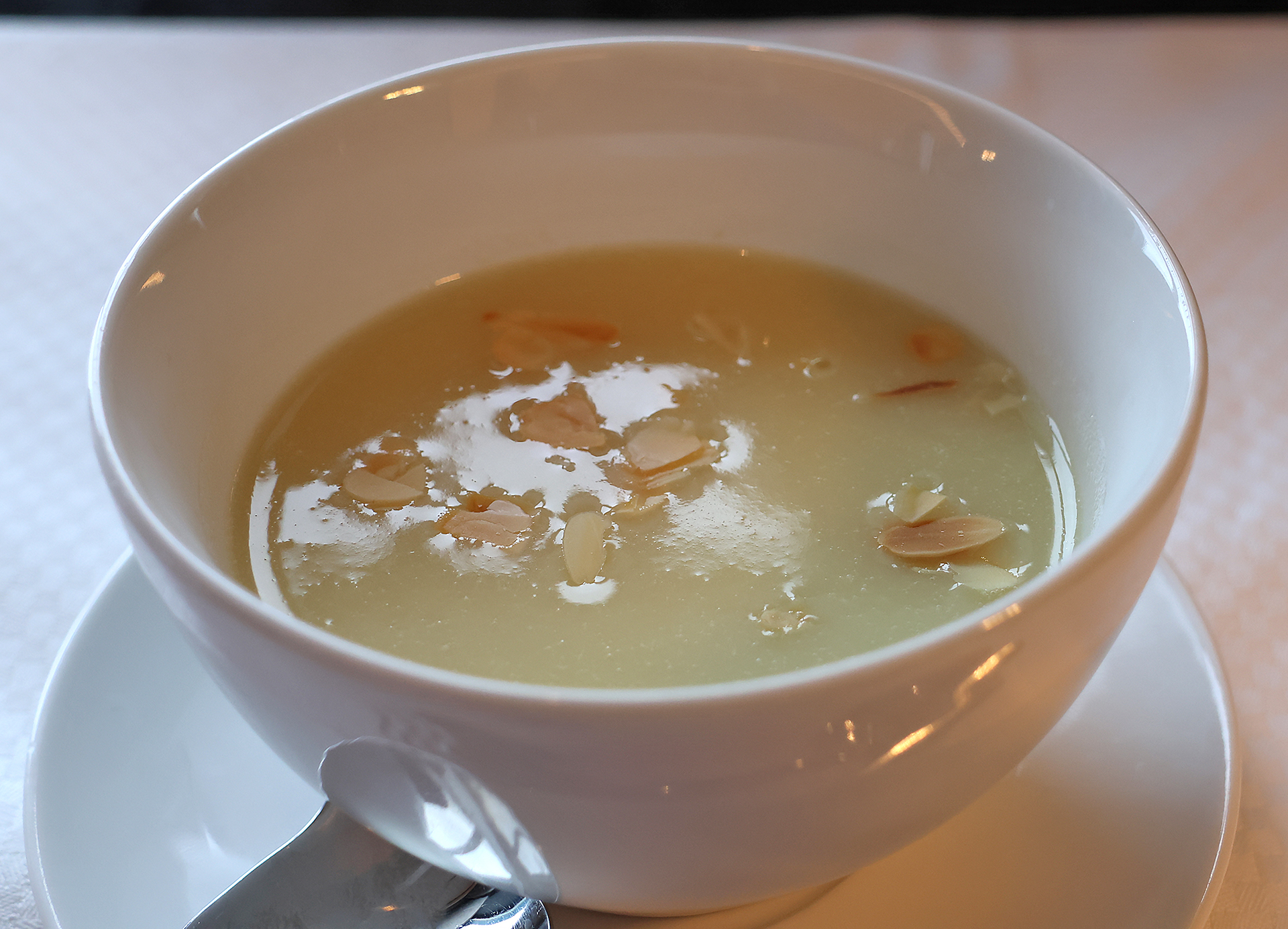 I decided to take a leek in public; so urine luck. I had the Potato & Leek soup with toasted almonds. The soup was fine. It was not my type of soup — but I gave it a try, as what did I have to lose? I finished the soup except for the slivered almonds, which I left over because I do not like nuts. Strangely, I do like Good Humor toasted almond ice cream…?!?
