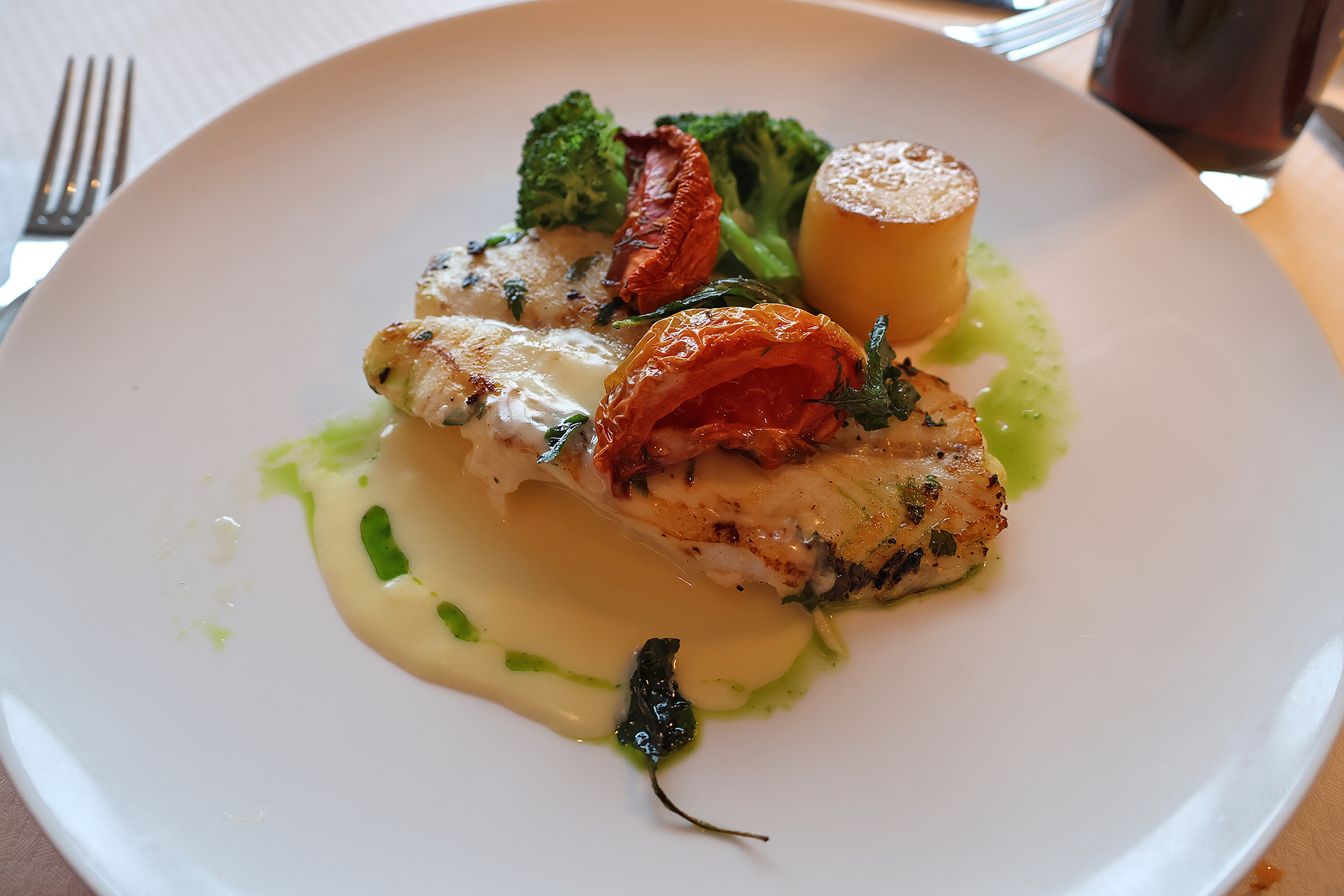 Herb marinated tomatoes, broccoli, and fondant new potatoes were the side dishes of the Orange Roughy in a lemon beurre blanc sauce, which is what I ordered for the main course that evening.