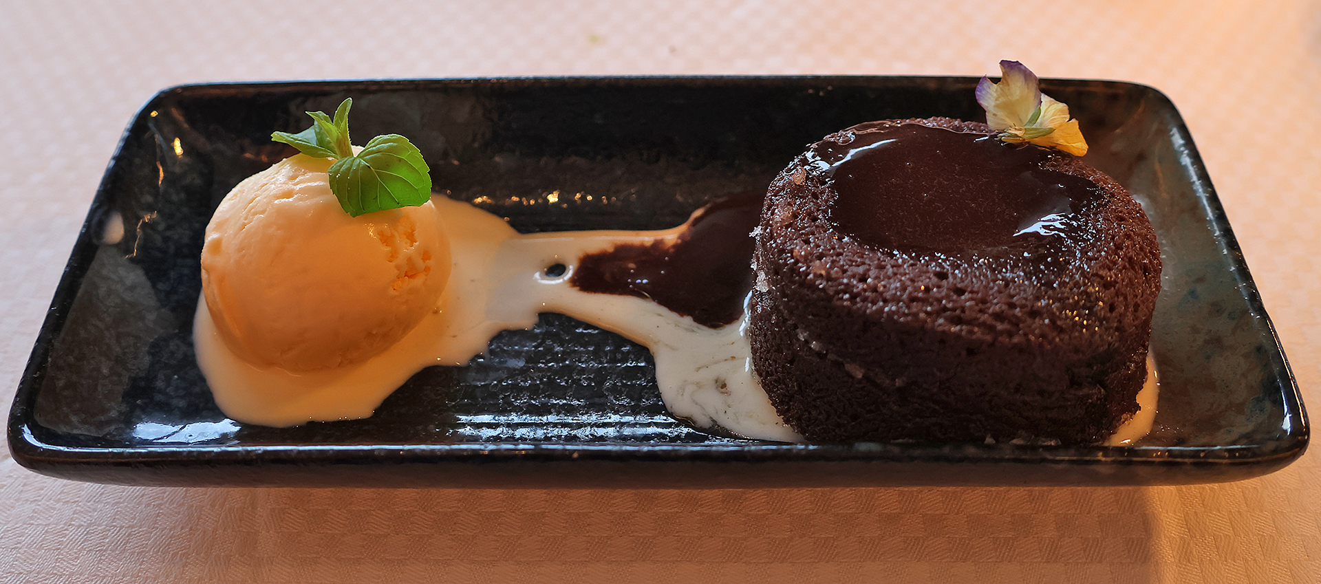 For dessert, I had the Kalafate ice cream, which came with a small warm chocolate cake and a fresh sprig of mint. This was a great way to top off a tasty meal.
