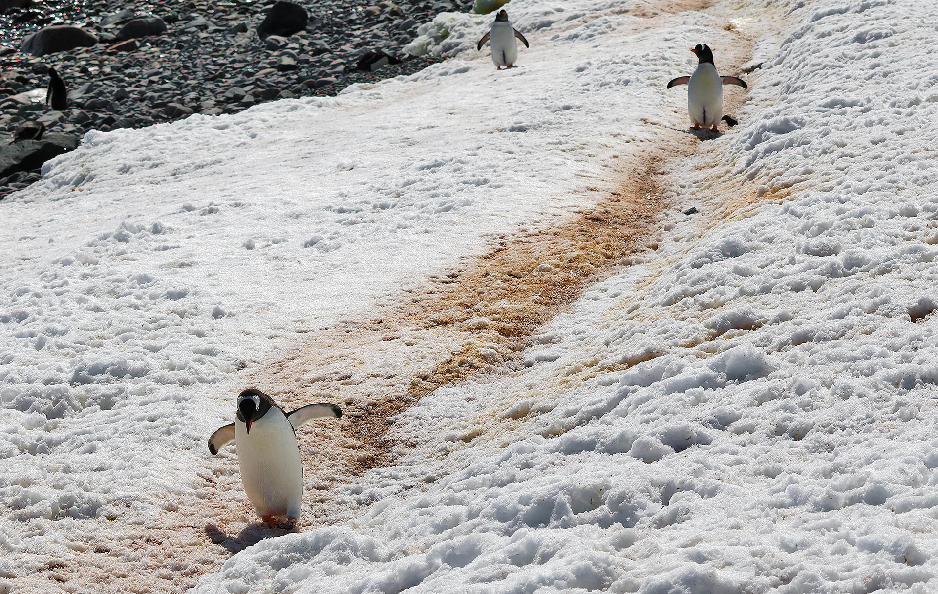 The penguin highways that are well used can be of a brownish color. Notice how they need to watch where they are walking.