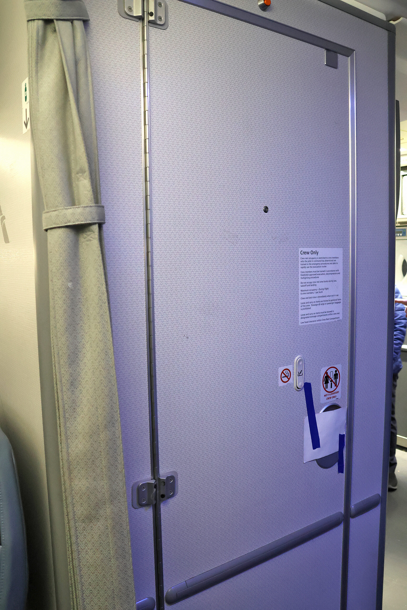 One placard on the door read “NOT A LAVATORY CREW ONLY”; so I suppose those lavatories were only for their use, which seemed illogical and nonsensical to me. Perhaps I simply have never noticed that placard before; but I do not recall seeing it in my past travels.