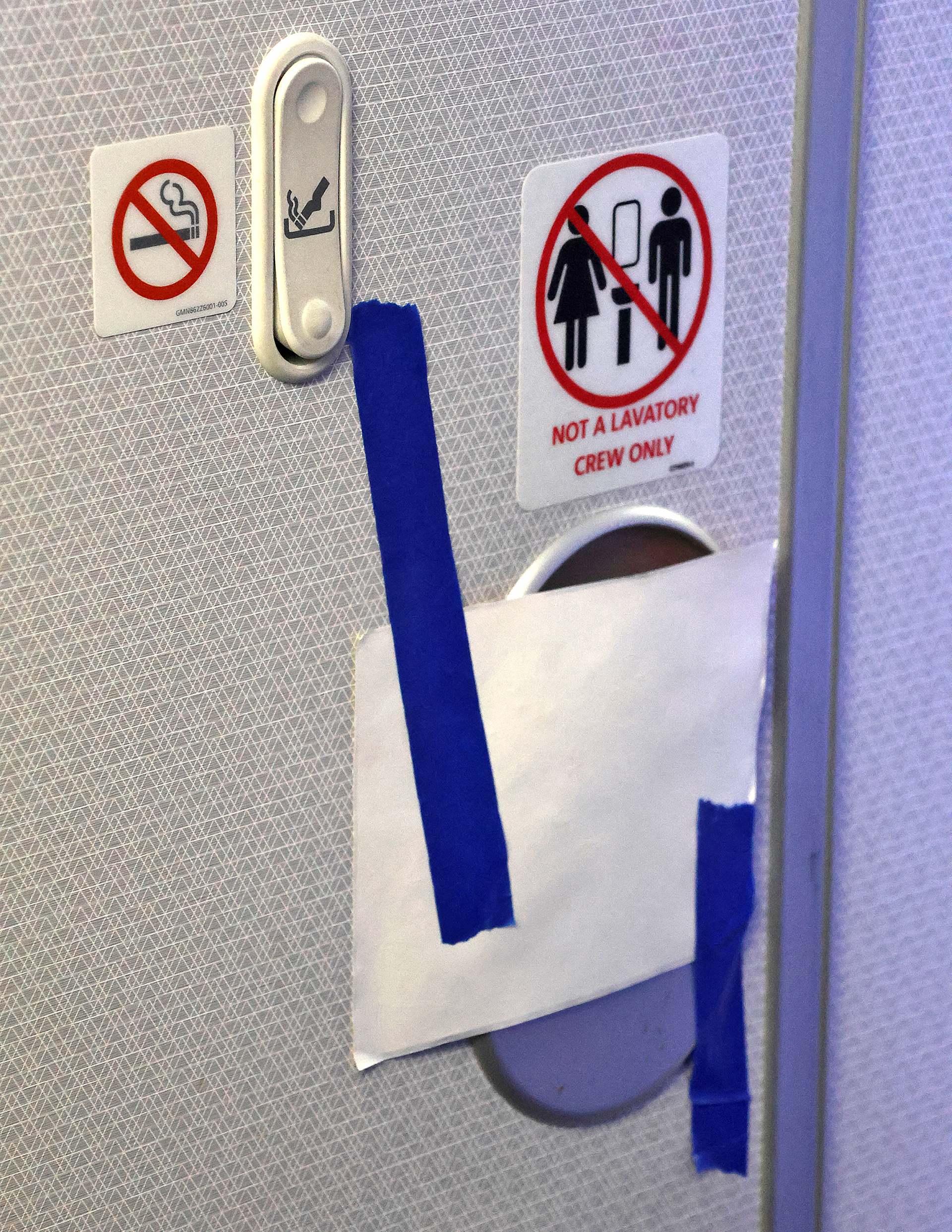 According to the seat map of the airplane, two lavatories were located near the rear of the aircraft — but when we approached our seats in the second to last row of the airplane, a member of the flight crew was busy applying blue tape on a white piece of paper over the handles of the doors to both lavatories in the rear of the economy class cabin and informing passengers that both lavatories were out of service.