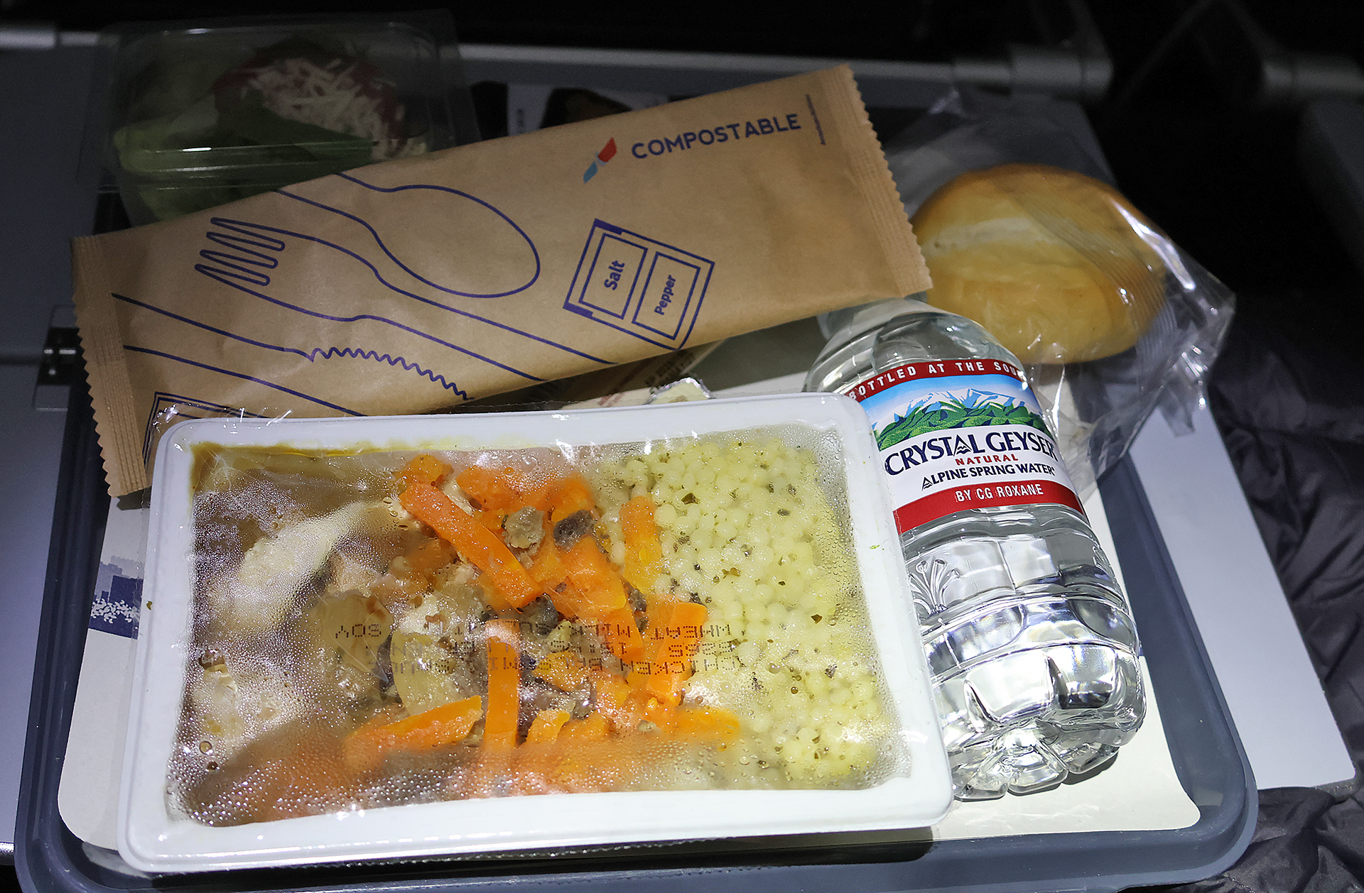The meal service followed not long after the airplane was in the air. The first course was a small package of pretzels. The choice of meals was either chicken or vegetarian pasta. I imagined that the vegetarian pasta could probably have tomato sauce and vegetables, which sounded great and would hit the spot.