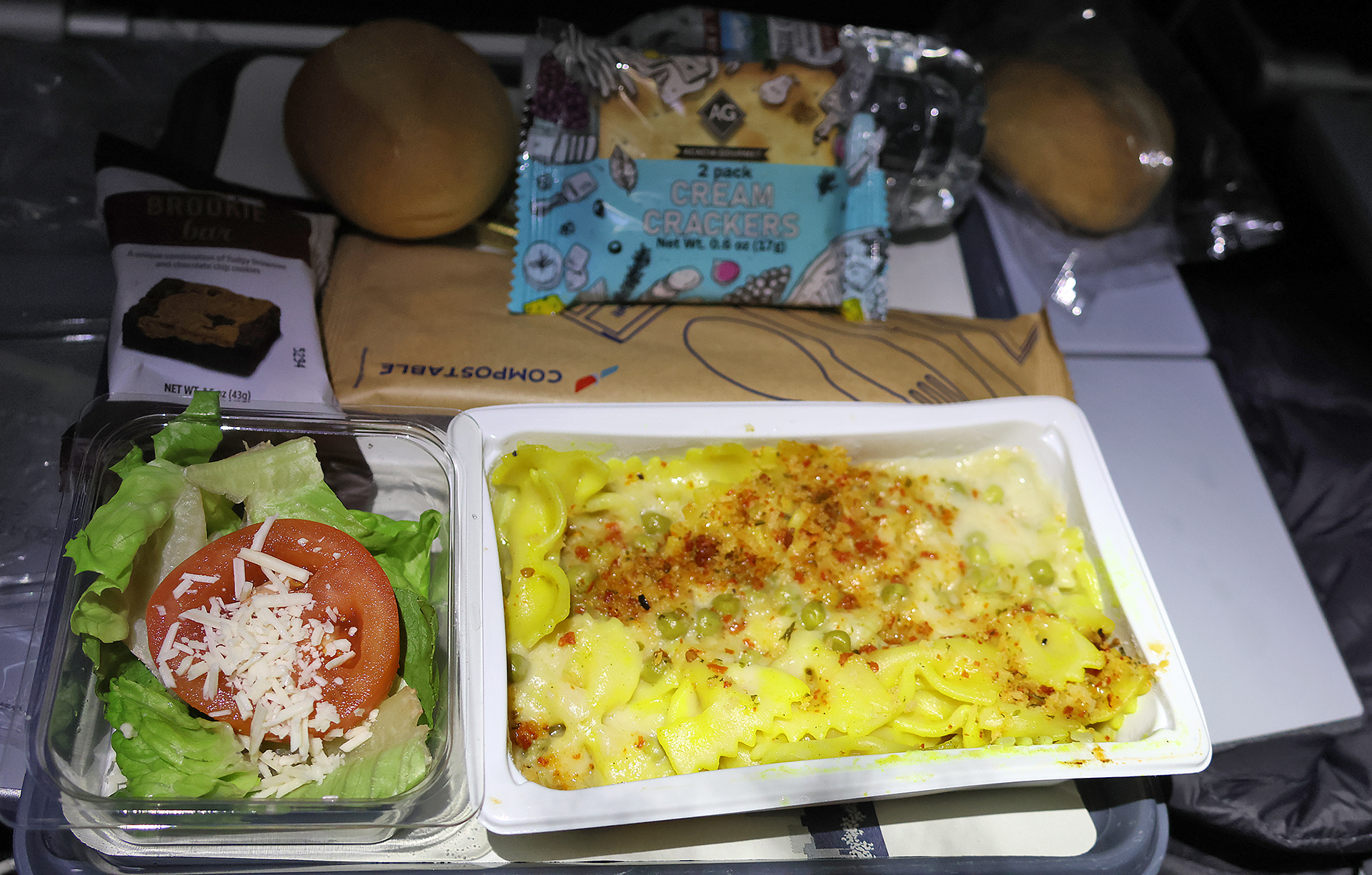 The Farfalle Tetrazzini consisted of large bowtie pasta in a buttery creamy cheesy sauce with peas. The dish contained way too much dairy for me to consume. A roll, a salad of lettuce and sliced tomato with shredded cheese, a packet of Vibi Mediterranean extra virgin olive oil 70 percent and balsamic vinegar of Modena dressing, a small packet of two Acacia Gourmet cream crackers, a wrapped pat of butter, and a packet of brownies with chocolate chips came with the meal.