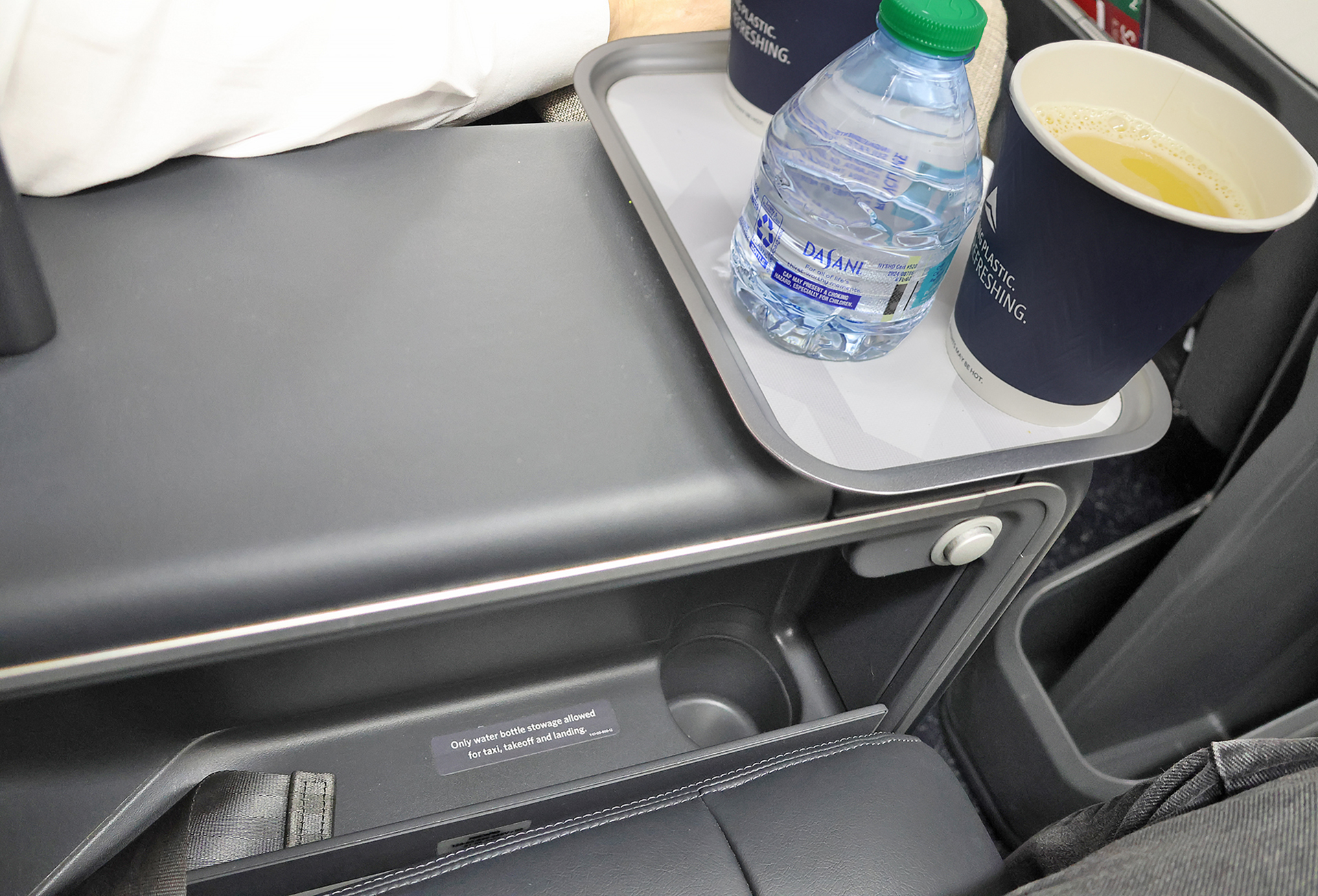 The center console allowed room for a tray with beverages to be rested on it — as well as a button to recline the seat. A cup holder was available inside the console — but neither a cup nor the bottle of water would fit in it. Perhaps that was merely an anomaly.