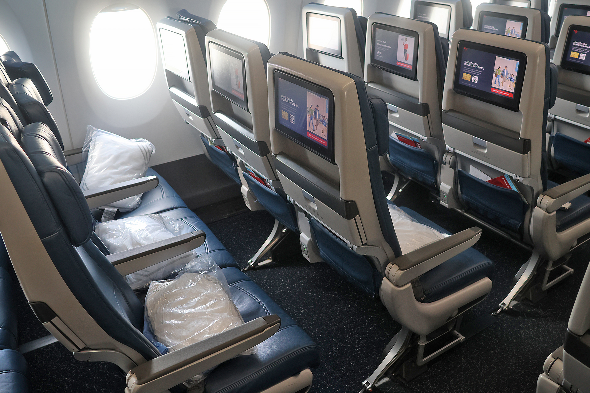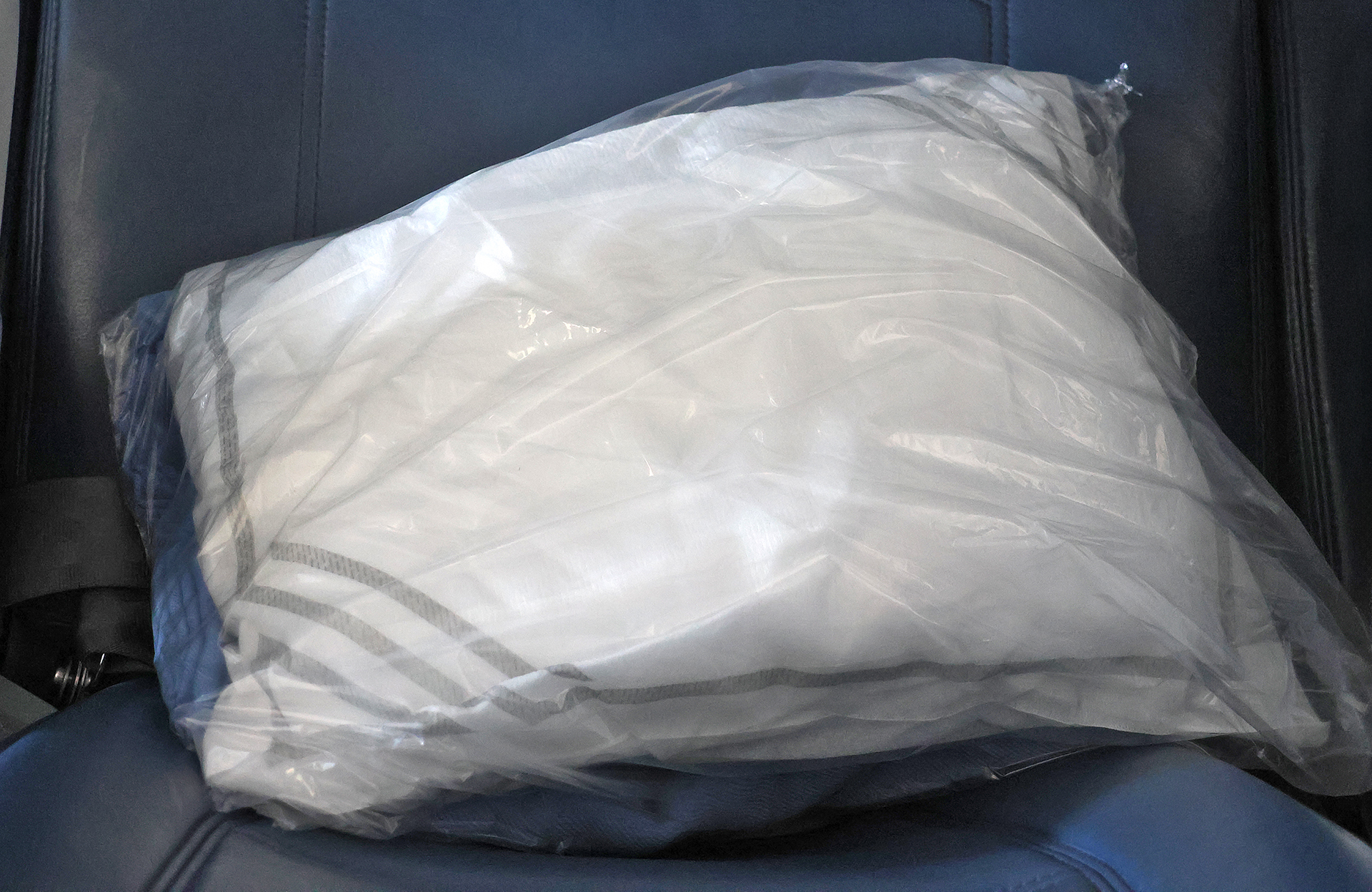 Standard pillows and blankets that were wrapped were placed on every seat in the economy class cabin.