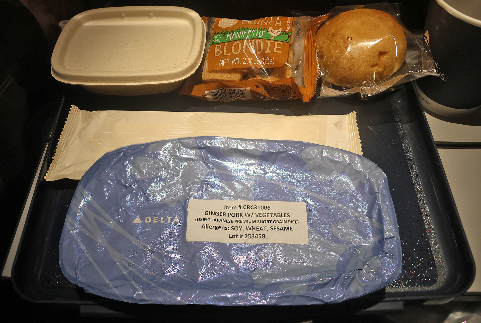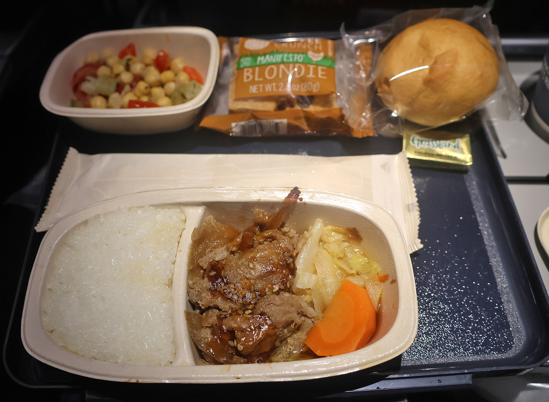 For the flight on which I was a passenger, three choices were available for dinner in the main cabin: chicken, pasta, or pork — that is, until members of the flight crew finally reached my row, when all that was left was pork. I never did get to see for myself what actually were the chicken option or the pasta option.