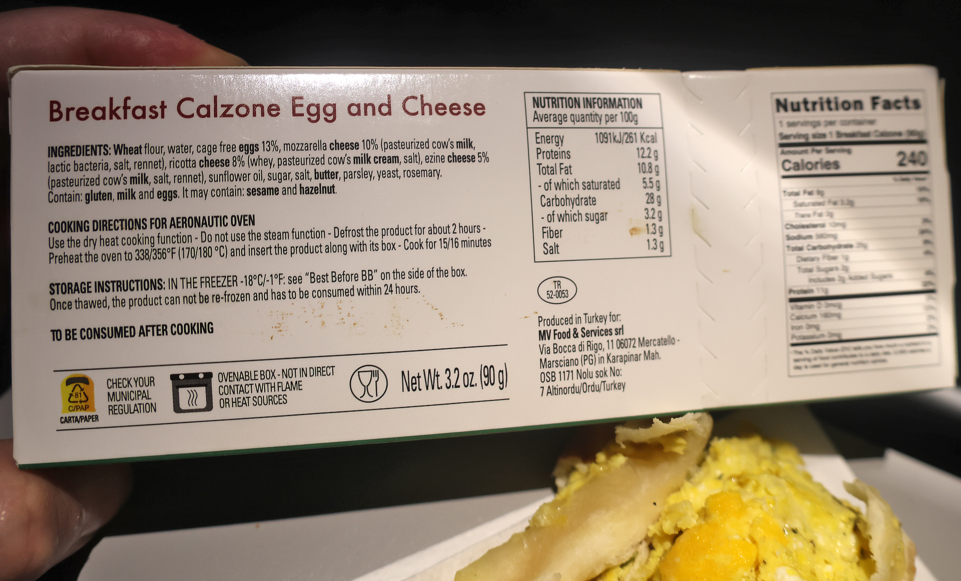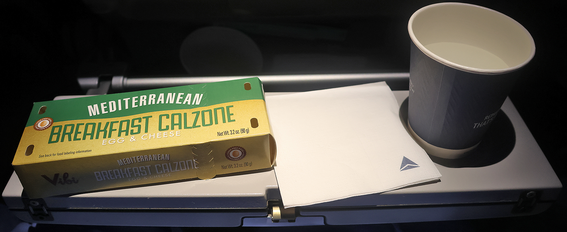 A breakfast calzone which contained egg and cheese was given out with a choice of beverage during the middle of the flight as a snack.