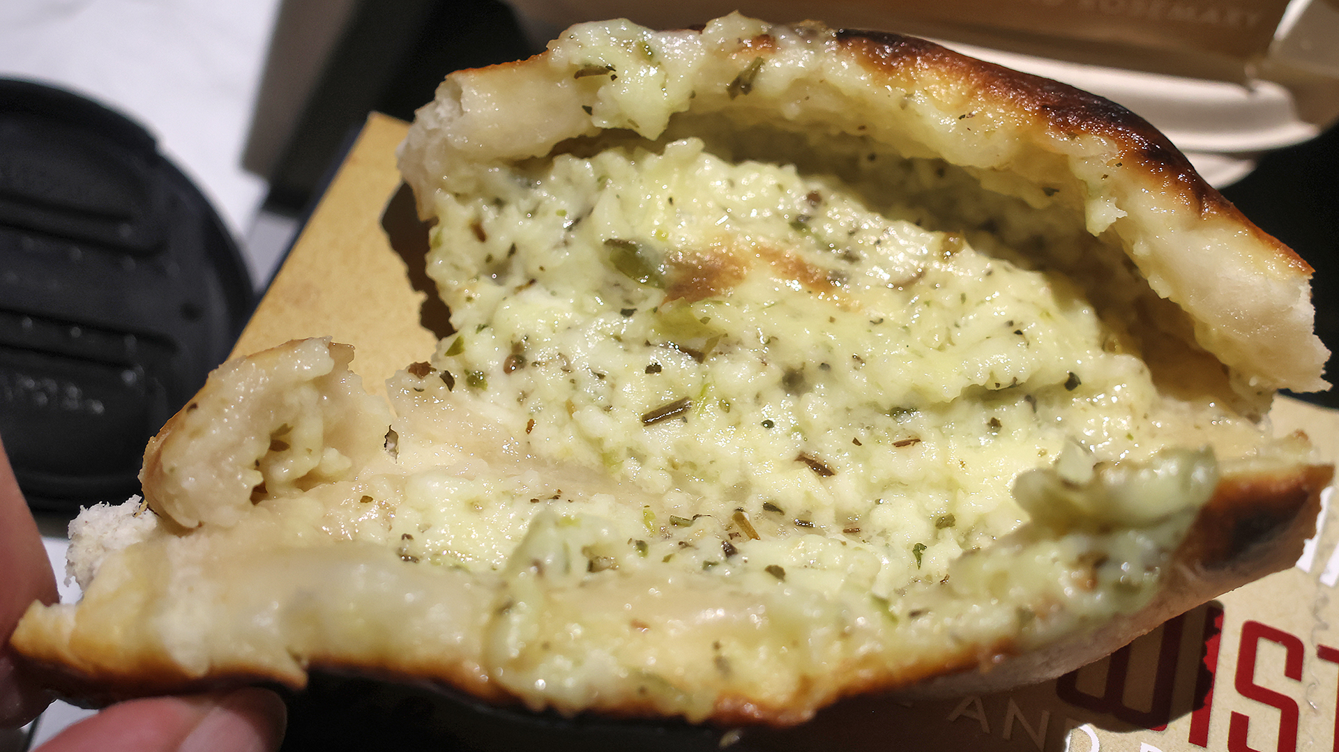 As with the aforementioned breakfast egg and cheese calzone, the outside crust of the pizza twist actually looked fairly decent; and similarly to the calzone, the inside of the pizza twist appeared — and smelled — unappetizing. I only ate some of the crust that was not touched by the three cheeses out of hunger.