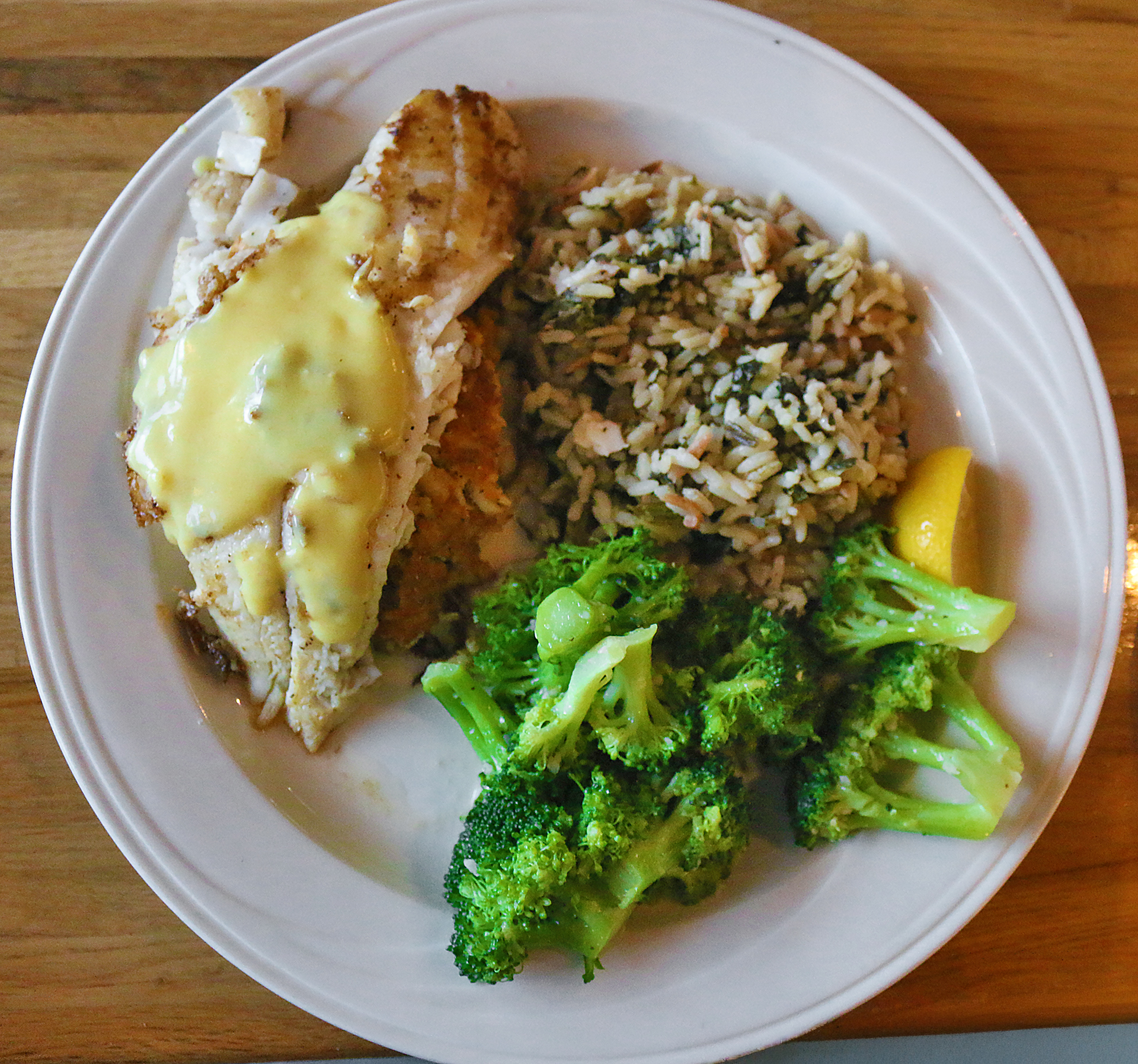 My main course was the Stuffed Flounder, which was grilled; stuffed with crab; and topped with hollandaise sauce. Spinach leek rice was served with it. I ordered broccoli as the vegetable of choice. I polished off the plate. $30.00