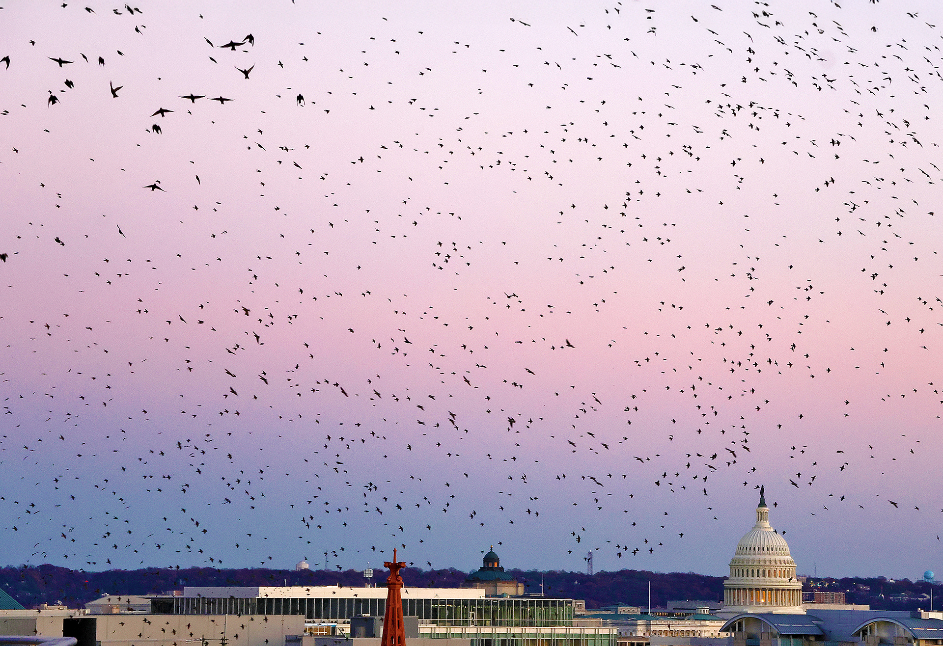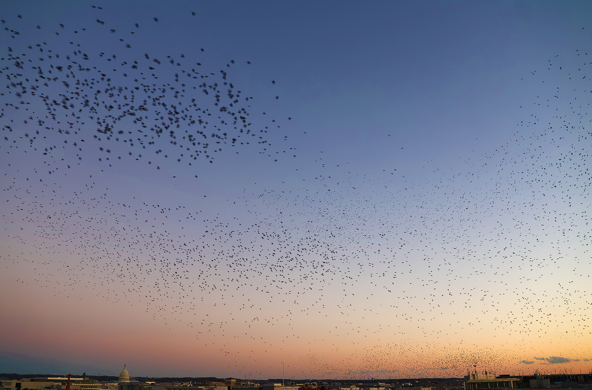 No one definitively knows why starlings form these murmurations of literally thousands of birds flying seemingly aimlessly through the sky, as no one bird is a leader. Murmurations supposedly keep the starlings warm while offering protection against predators.