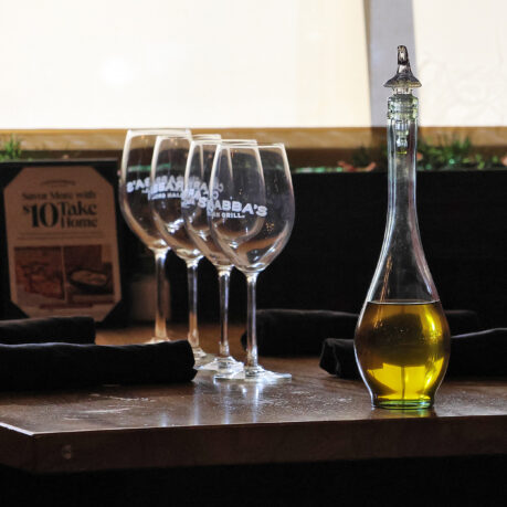 Olive Oil Bottle and Stemmed Glassware. Sunday Morning Photograph.