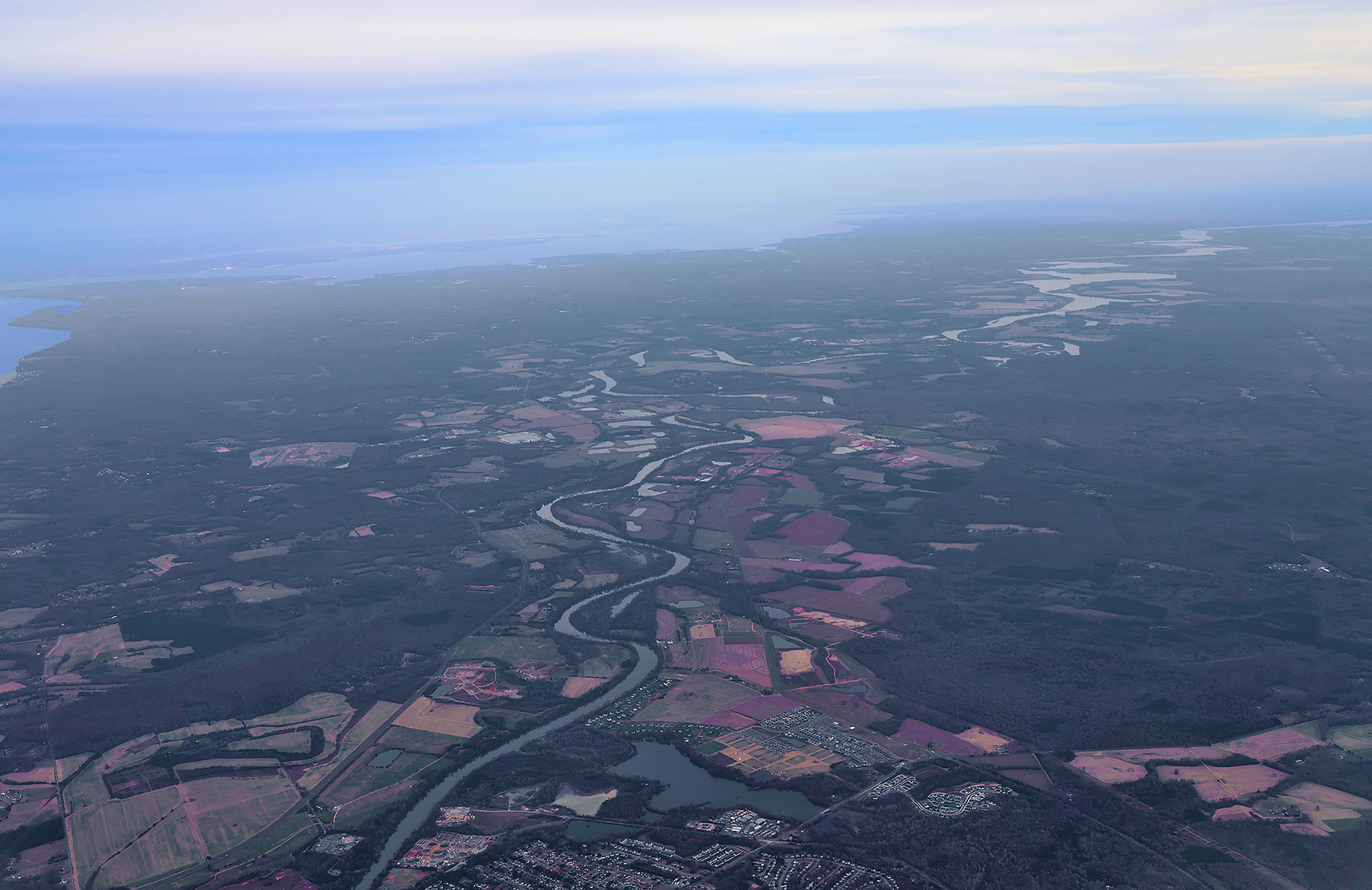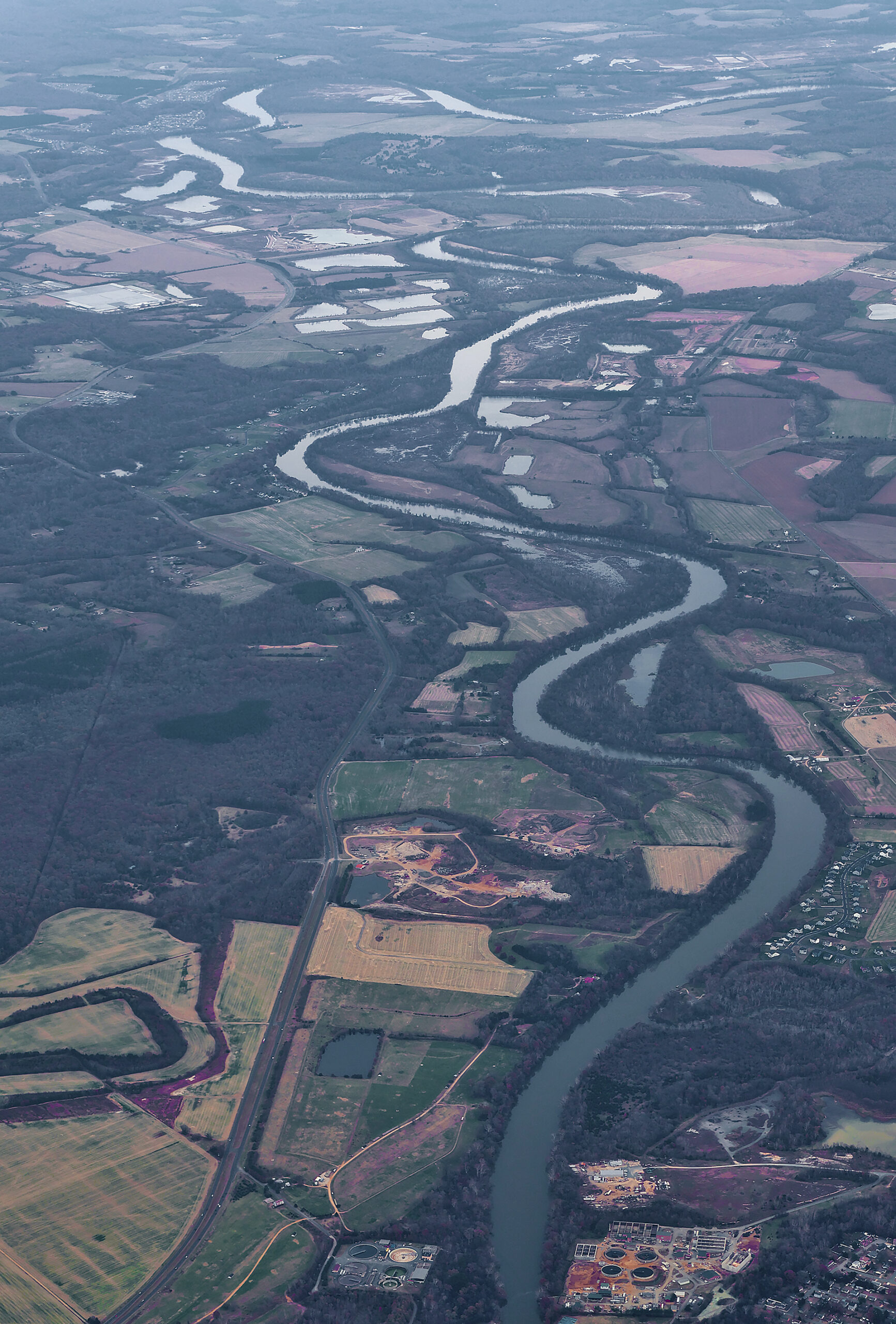 I enjoy taking photographs from airplanes during flights; and a squiggly river — which I believe is the Rappahannock River in Virginia — caught my eye as the airplane was heading north during its descent towards its destination of Washington Dulles International Airport.