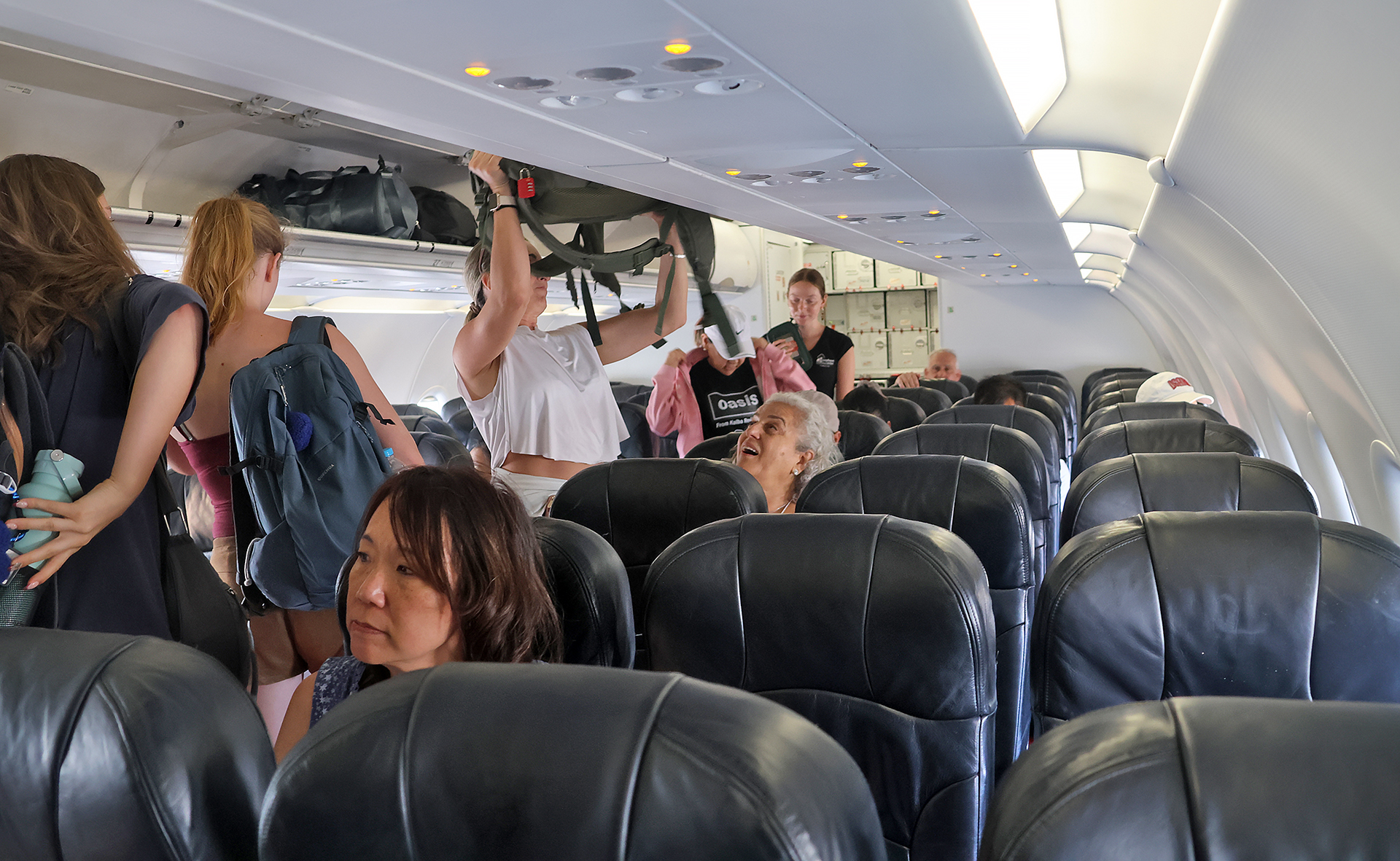 Plenty of room for storage was available in the overhead compartments. The standard weight limit for carry-on bags is seven kilograms for up to two bags, which is almost 15.5 pounds — but an additional seven kilograms can be purchased for a nominal fee, which is what I did.