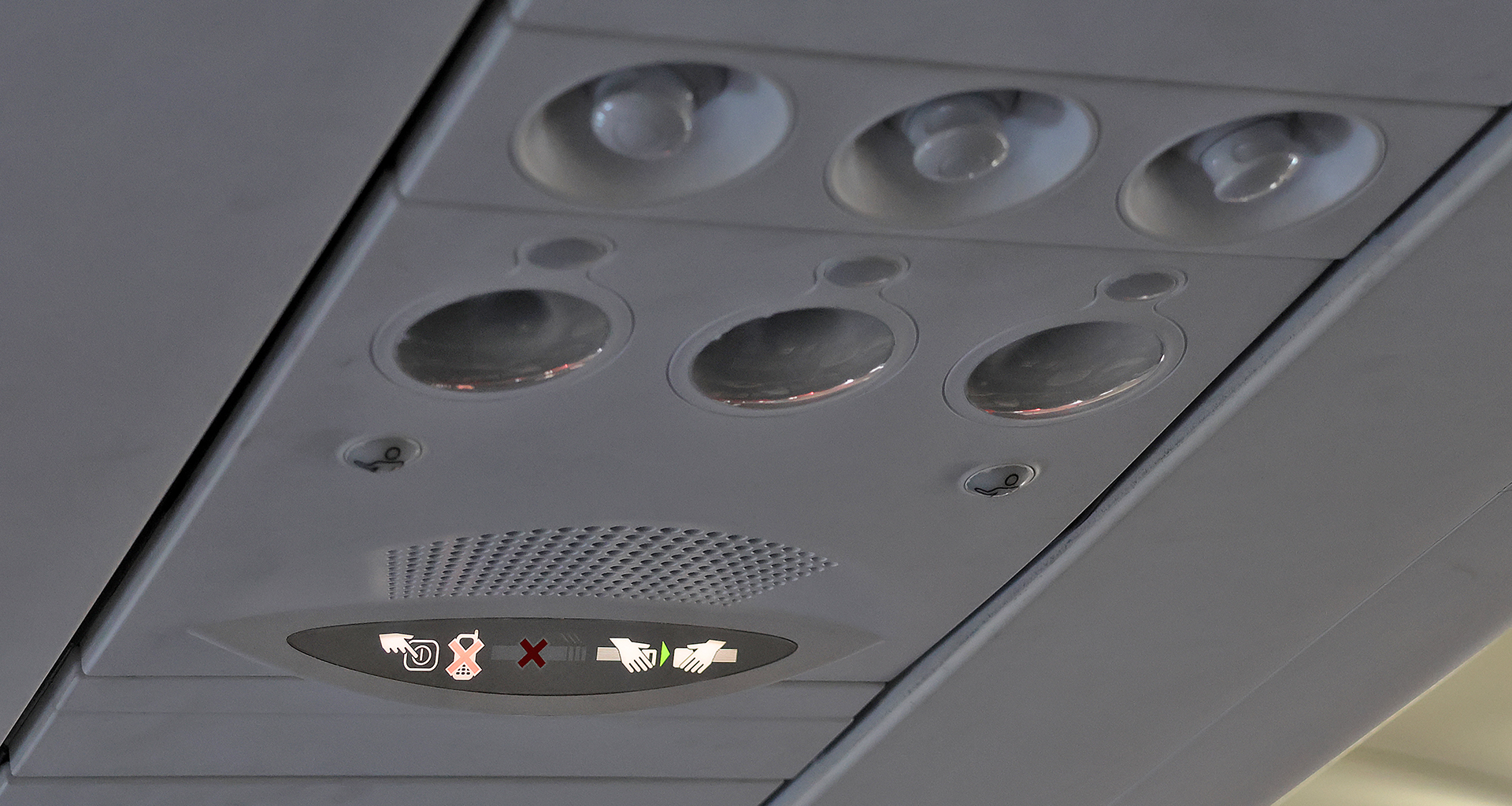 The Passenger Service Unit above the row of seats contained bright lights, adjustable air vents, and two small flight attendant call button for three seats.