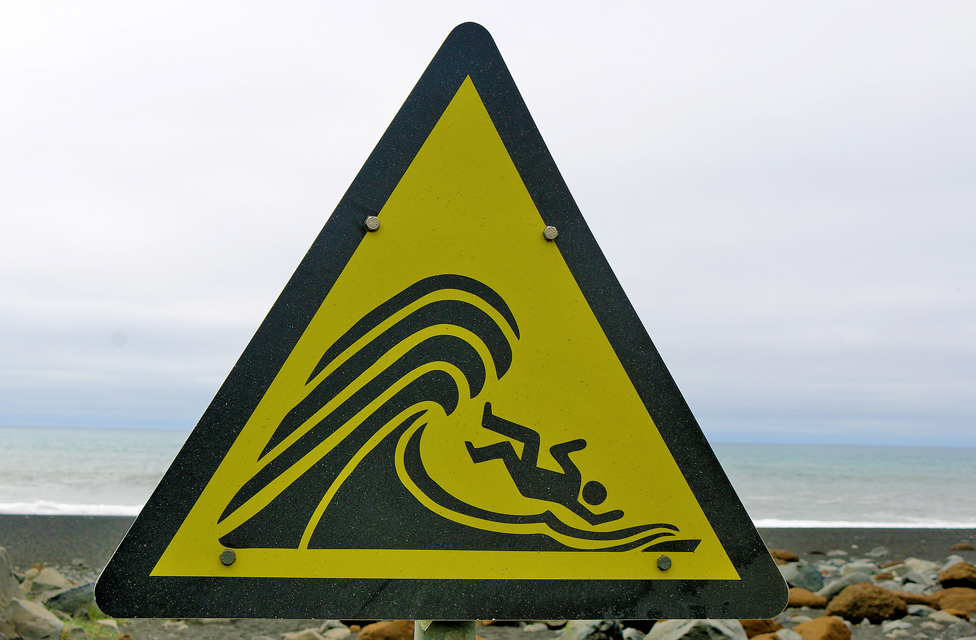 Yellow signs warn in five languages of “DANGEROUS SNEAKER WAVES!” — as well as to “keep a safe distance from the surf” and to “never turn your back on the ocean”.