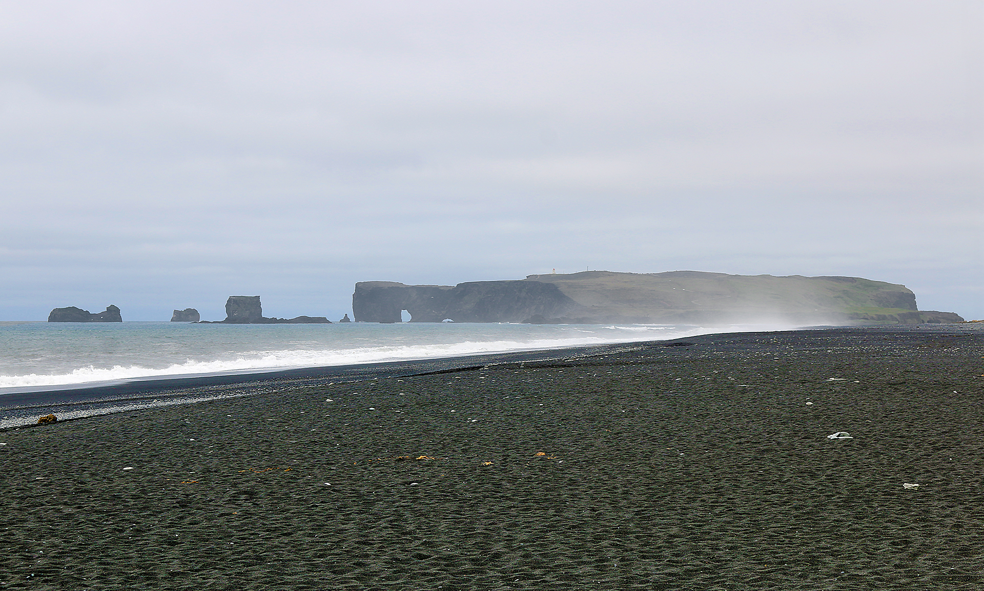 Dyrhólaeyjarviti — which is known in English as the Dyrhólaey Lighthouse — appears near the upper left corner of the photograph above.