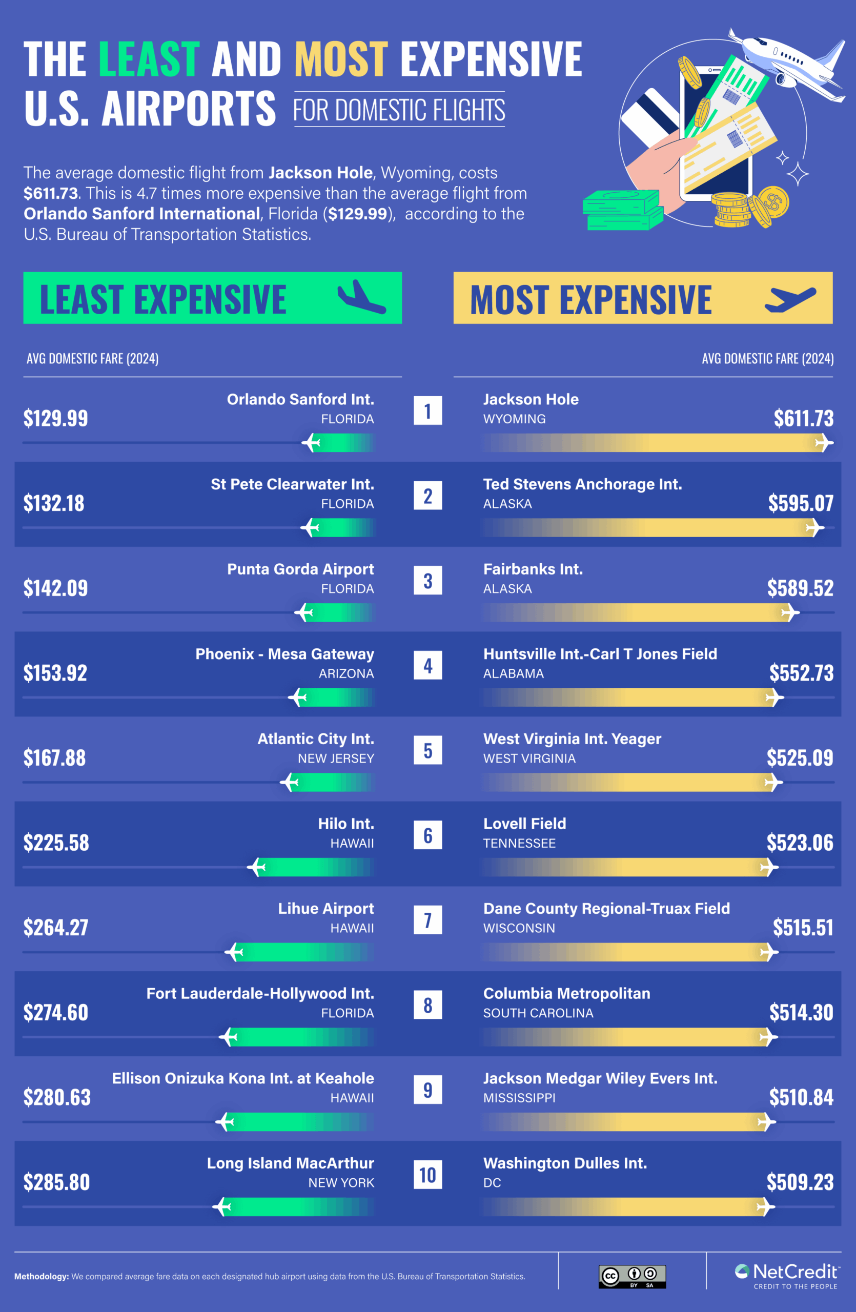 This article — which was written by Matt Pelkey from NetCredit — gives more details about the least expensive airports and states for domestic flights in the United States; and I have been given express written permission to use the graphs and the verbatim text from the aforementioned article in this article. While NetCredit has endeavored to ensure the information provided is accurate and current, it cannot guarantee it, as this information is general in nature only. This content is for informational purposes only and should not be considered as personal advice, financial advice, investment advice, tax advice, or legal advice. Neither NetCredit nor The Gate With Brian Cohen accept any liability — and assume no responsibility — for any and all information which is presented in this article.