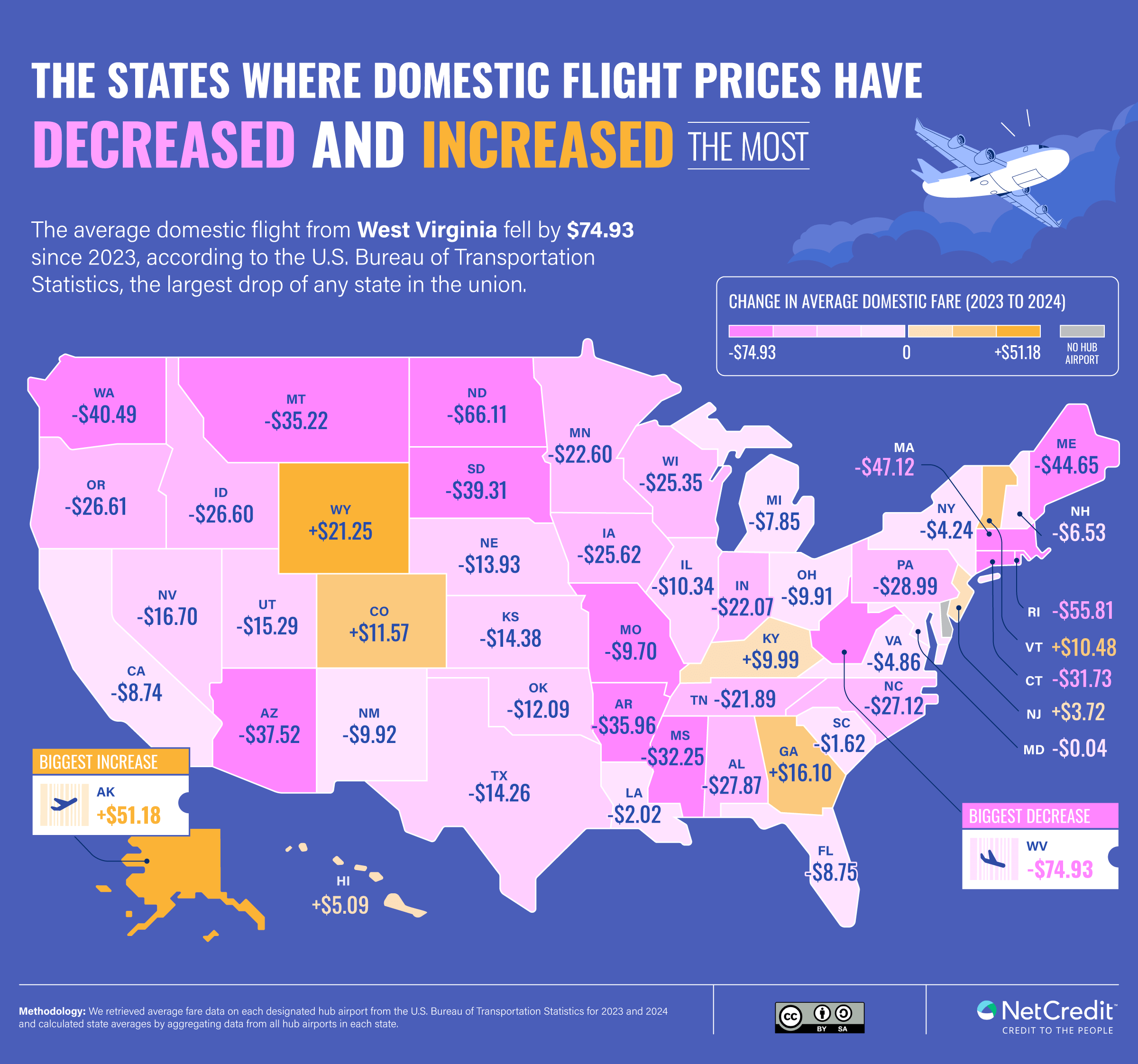 - The state with the biggest fall in domestic flight costs is West Virginia, where prices fell by $74.93 on average between 2023 and 2024.