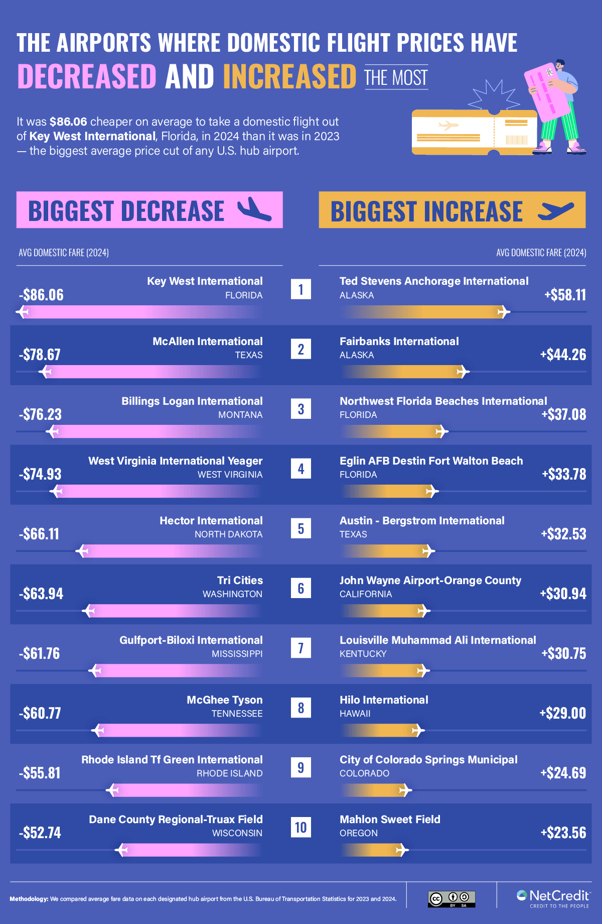 To help consumers make informed decisions, online lender NetCredit used government statistics to compare the average domestic flight costs from states and U.S. hub airports in 2024 to their equivalents in 2023. We also compared them to local average wages to find which states and airports are not only the cheapest, but the most affordable, for domestic flights.