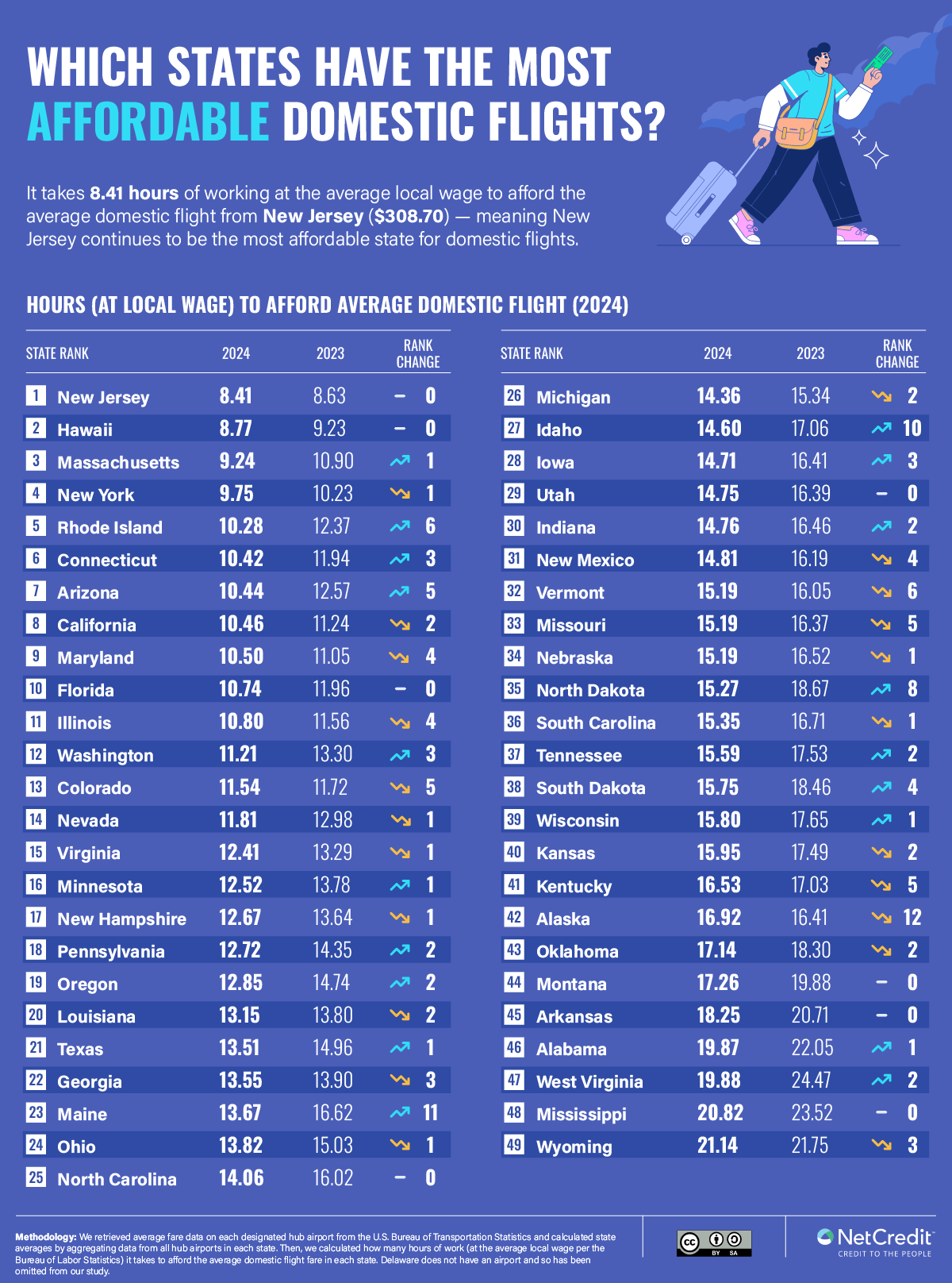 - New Jersey remains the most affordable state to fly domestically, with the average flight costing the equivalent of 8.41 hours’ work at the average local wage.