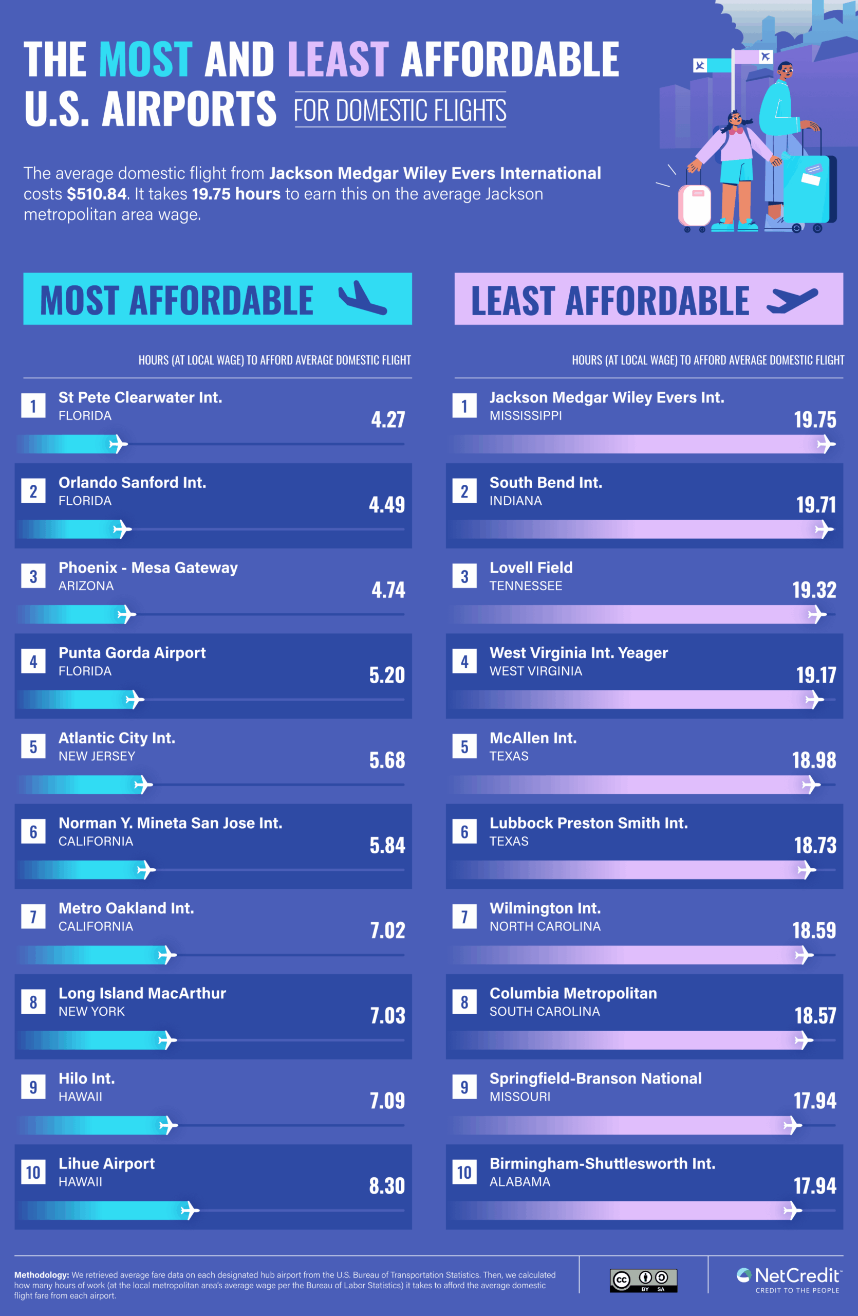 Would-be travelers need to work nearly five times as long near Jackson Medgar Wiley Evers International, Miss. (19.75 hours) and South Bend International, Ind. (19.71 hours). With flights averaging $510.84, Jackson Medgar Wiley Evers is America’s ninth most expensive airport. Meanwhile, Mississippi has both the lowest median annual pay among workers who’ve remained in the same job for more than a year and the second-lowest median wage growth in the country.