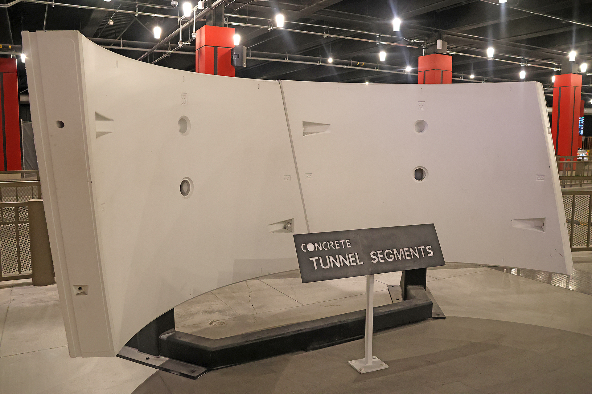 Tunnel segments are on display to greet passengers outside the glass doors at the bottom end of the escalator.